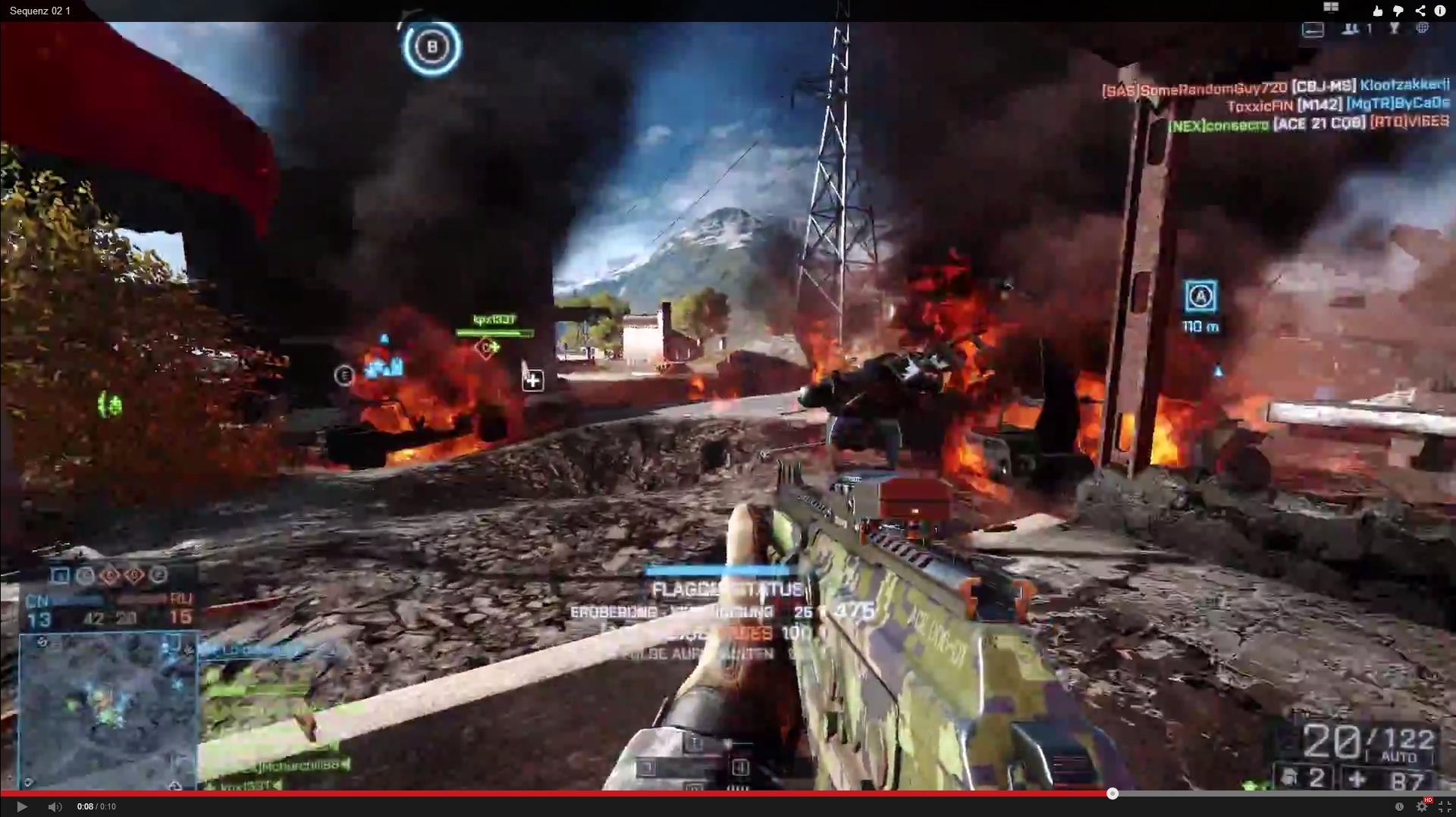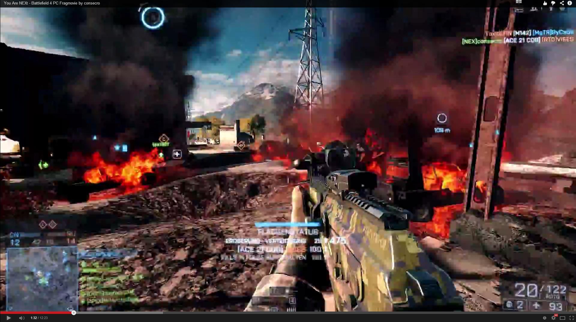 Zu meinem Problem: Ich habe das Battlefield 4 Video erstellt und es über diverse Rendering-Einstellungen über Adobe Media Encoder CC rendern/exportieren lassen. Die Videoqualität schwankt natürlich, hauptsächlich durch die verschiedenen genutzten Bitraten. Ich habe mich auf YouTube schlau gemacht und mir die jeweiligen Spezifikationen zu Herzen genommen. Ich habe mich trotz meiner schlechten Uploadgeschwindigkeit (regionaler Kabelanbieter 2,5 MB/s Down, ca. 110 KB/s Up) für die maximalen Spezifikationen eines Unternehmens entschieden, d.h. Audio 5.1 mit 512 kbit/s und Video mit einer Bitrate von 50 Mbit. Dementsprechend groß wurde das Video auch, ich lag mit einer Videolänge von 12:13 min bei einer Dateigröße von 4,15 GB, allerdings war die Qualität selbst bei schnellen Bewegungen "spitzenmäßig" wie auf dem Screenshot zu erkennen.
