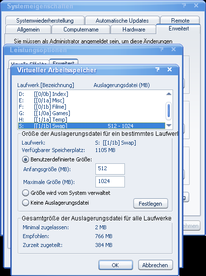 Heute kam ich dann auf die "Schnapsidee" die Auslagerungsdatei auf meine SP1614C zulegen. Also richtete ich fix eine ca. 1GB grosse Partition auf der Platte ein und formatierte diese im FAT-Dateisystem (den Rest der Platte formatierte ich ins NTFS-Format).