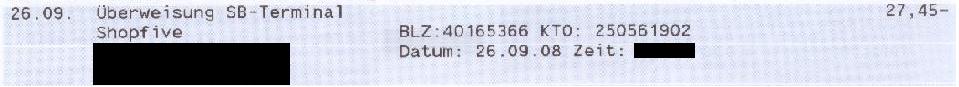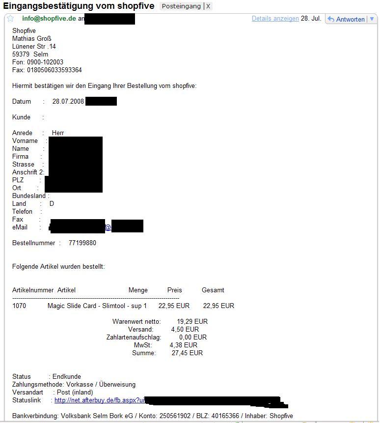 28.07.2008 , habe allerdings nicht zu der zeit gezahlt, da ich nicht sicher war ob ichs nun kaufen sollte, schließlich überwies ich die 27,45€ am 26.09.08 zu dem Shop ( shopfive.de ) . Da auf die Bezahlung der Bestellung noch gewartet wurde, bzw immernoch gewartet wird, hat das kein Problem dargestellt.