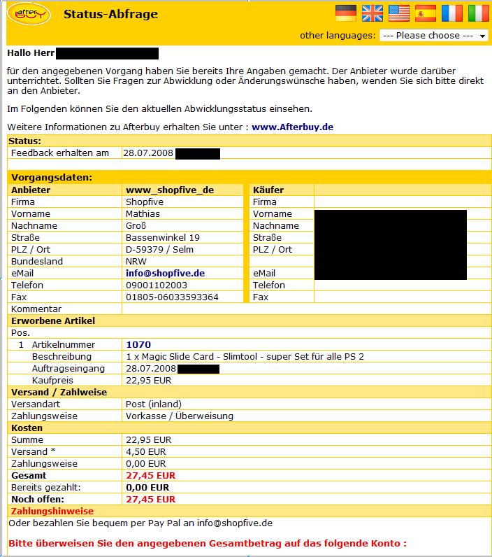 Der Bestellstatus link sagt mir seit Bestell aufgebung: "bereits gezahlt 0.00€" , obwohl ich seit 15 tagen überwiesen habe. Auf meine emails antwortet der shop nicht, und die 0900 nr ruf ich nicht an, da wird warscheinlich eh keiner dranngehen bzw nur warteschleife.