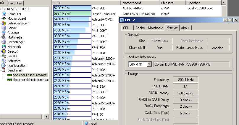 ich hab meinen PC nochmal aufgerüstet, um wg. des kommenden BTX-Standards nicht mein schönes Case wegwerfen zu müssen. Ich wollte was richtig gutes, also habe ich mir ein Asus P4C800-E Deluxe bestellt, einen 3.2 GHz P4 (Northwood) und dazu passend 2x 512 MB Corsair TwinX1024-3200LL. Mein Problem: ich bekomme das RAM nur in SPD-Mode zum laufen und der liegt bei CL 2,5, obwohl der Speicher lt. der Corsair Website mit 2-3-2-6 spezifiziert ist. Stelle ich diese Werte manuell ein, startet das Board nicht (auch nicht, wenn die DRAM-Spannung auf 2,85 V erhöhe).