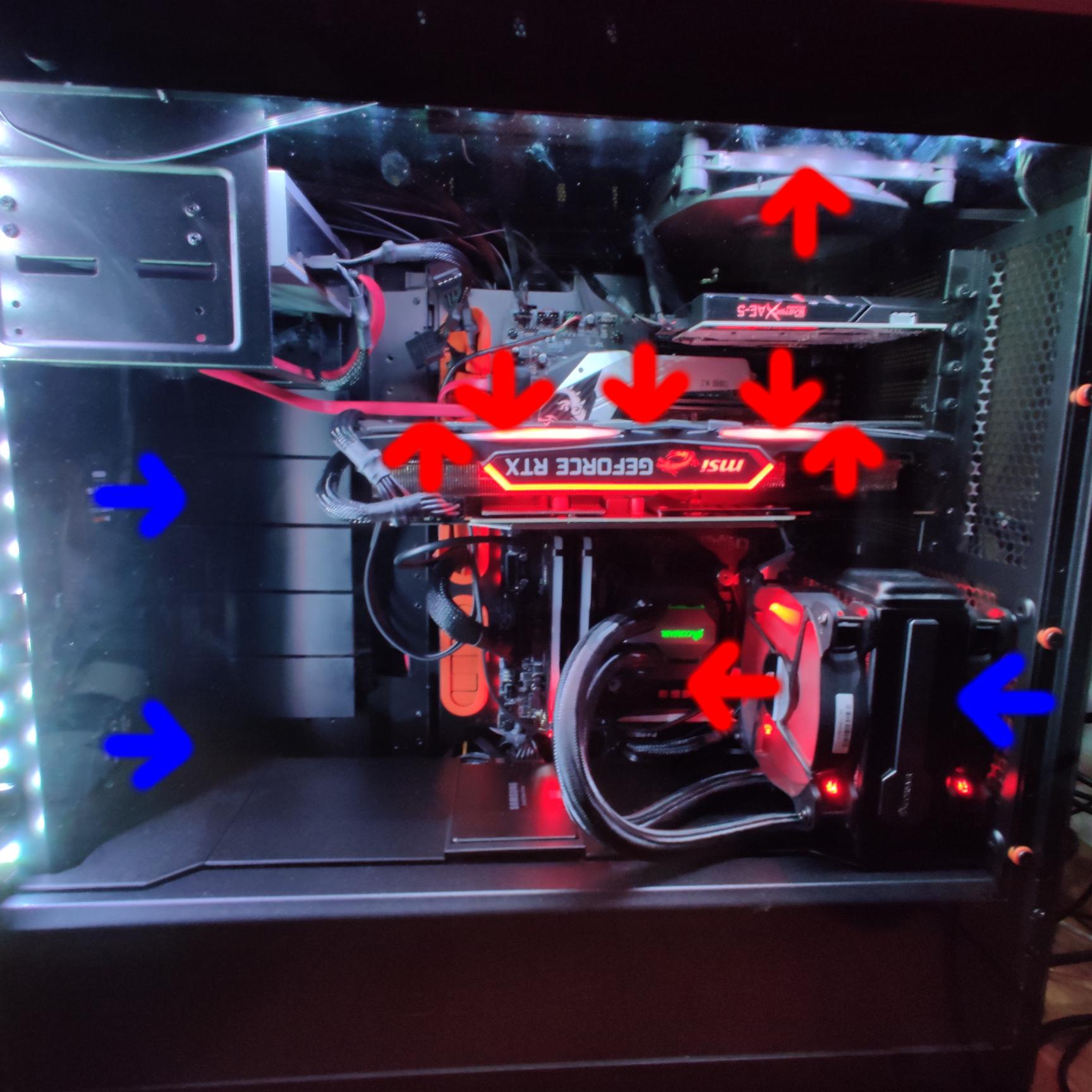 Nun ist die Frage, wie lasse ich am besten die Luft fließen? Momentan ist es so, dass die zwei front-Lüfter Luft rein holen, die zwei Külerlüfter ebenfalls. Und oben wird die Luft ausgeführt.
