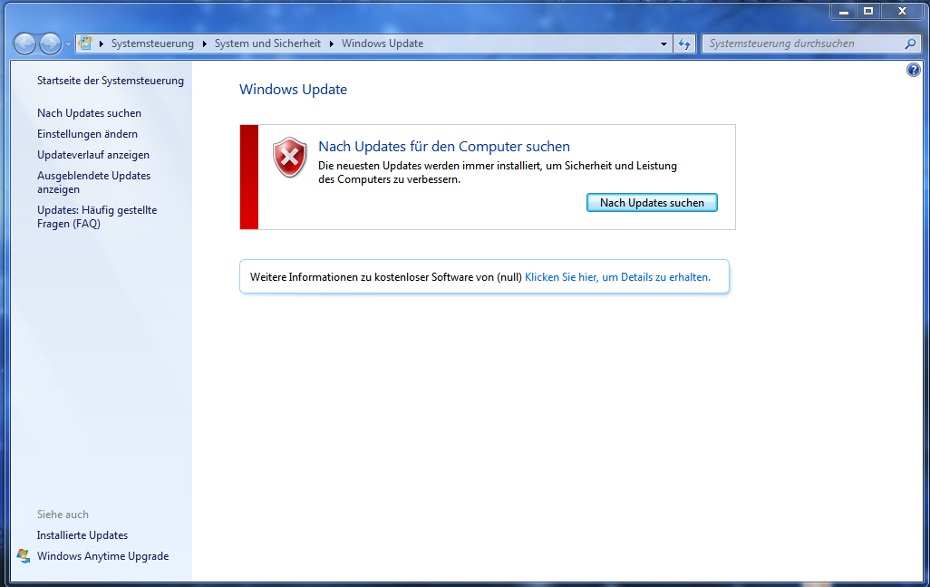 Laut der Mangement-Konsole sind die notwendigen Dienste aktiviert (Windows Update und Kryptografiedienste), dennoch meldet das Programm beim Start der Updatesuche, dass der WUDienst nicht gestartet ist. Desweiteren verwirrt mich ein wenig, dass im Text "Weitere Informationen zu kostenloser Software von (null)" anstelle von (null) nicht mehr Microsoft Update steht. MS Update hatte ich bis dato immer aktiviert.