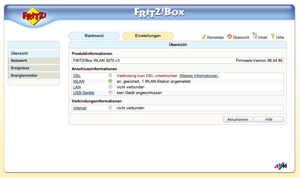 Das Problem ist: Ich bin Online-Journalistin und brauche das Internet daher nicht nur in der Freizeit, sondern auch, um Brötchen zu verdienen. Ich bin darauf angewiesen und wenn da etwas nicht funktioniert, macht mich das kirre. Ich schilderte einem Bekannten das Problem, der mich für so blond hielt, dass er zuerst vermutete, dass ich in den Einstellungen eingegeben hätte, dass die Internetverbindung nach einer angegeben Zeitanzahl gekippt wird. Ähm, nein. Er hat sich dann im Internet erkundigt, ob eine allgemeine Störung der Internetverbindung von 1&1 vorliegt - negativ. Daraus schloss er dann, dass die Fritzbox einfach ihren Geist aufgegeben hat. Weil ich auf Internet angewiesen bin, war er so nett und hat mir dann eine neue gekauft. Die Fritzbox 3270 v3. (Ja, die ist ohne Telefonstecker, aber ich telefoniere sowieso nie über Festnetz, von daher habe ich das Geschenk dankend entgegengenommen.)