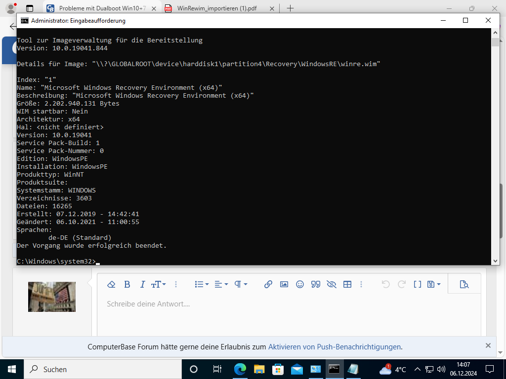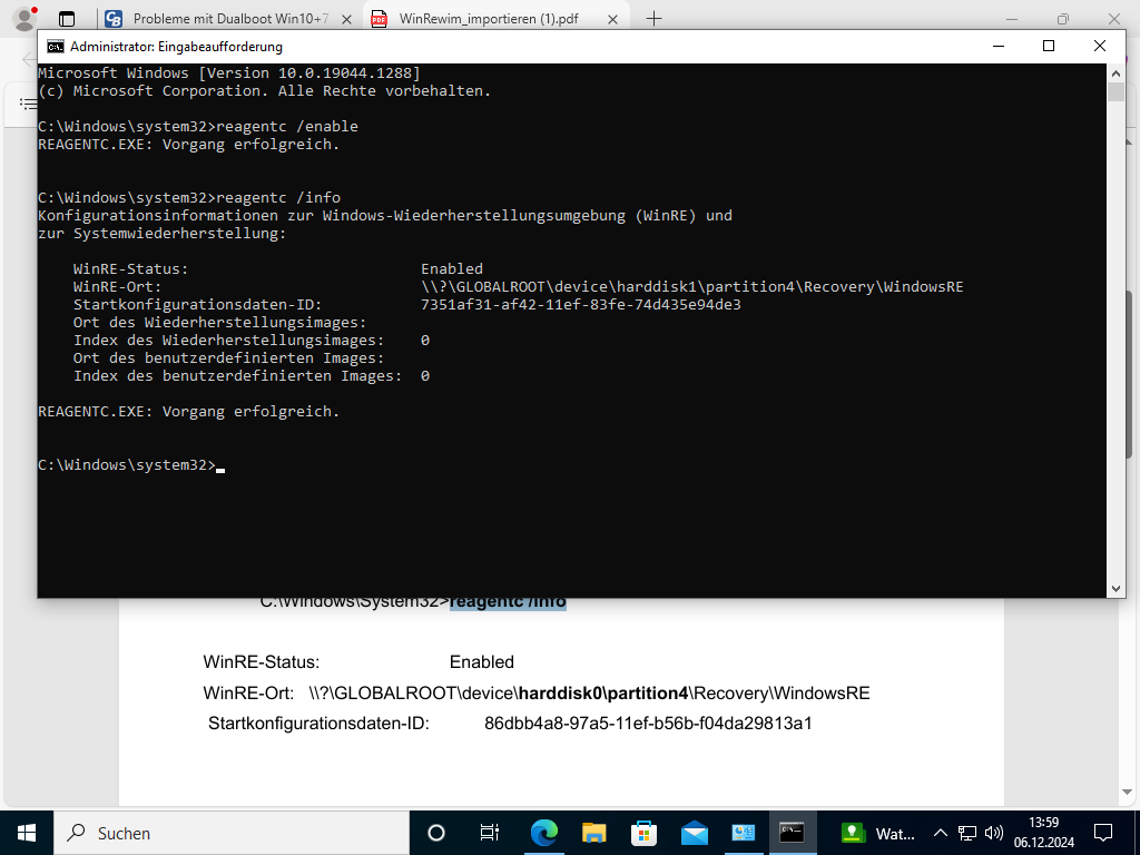 Da nun wieder alle den gleichen Stand haben, geht es auch im Gleichschritt weiter: Wir müssen REAGENTC.EXE mitteilen, wo die Datei Winre.wim zu finden ist. Hierzu müssen wir über die Eingabeaufforderung unsere Betriebssystempartition und den Pfad benennen. Im Suchfeld der Startleiste das Wort Eingabeaufforderung eingeben und Als Administrator ausführen anklicken. NO steht für die Nummer der Festplatte und NR für die Nummer der Partition. WICHTIG: An dieser Stelle geben wir die Nummer der Windows-Partition an, denn wir verweisen ja auf den Speicherort der Datei Winre.wim!