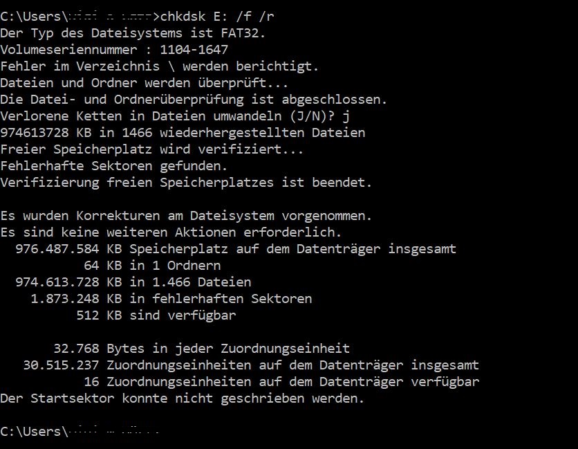 - Via Eingabeaufforderung CMD: "chkdsk E: f/r" und danach noch "scf /scannow" eingetippt. (davon gäbe es Screenshots, falls es hier hilft).