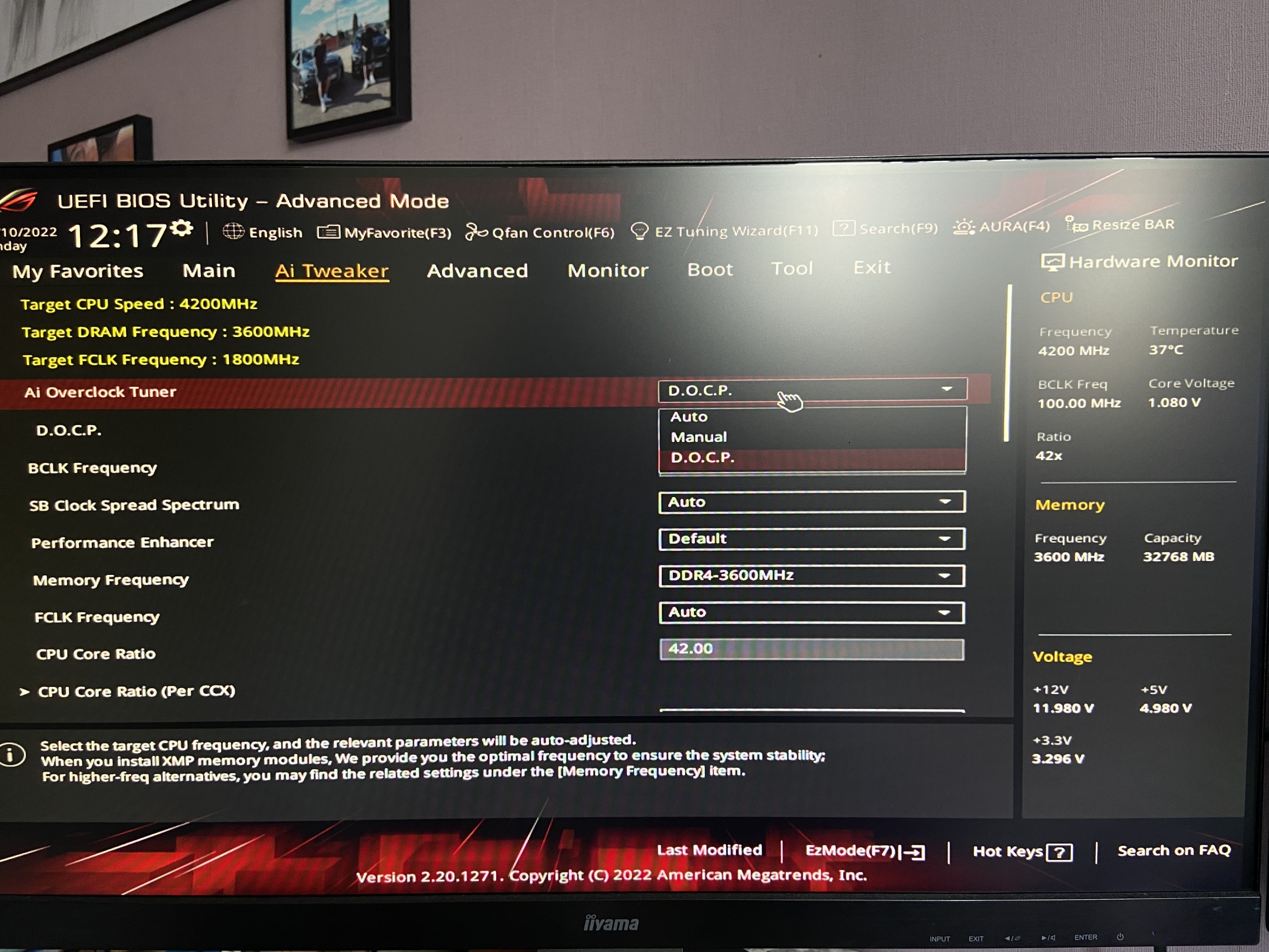 „Performance Bias” mal auf „None” stellen. „Ai Overclock Tuner” auf „D.O.C.P.” Der RAM-Takt müsste dann bei 3600 MHz liegen.