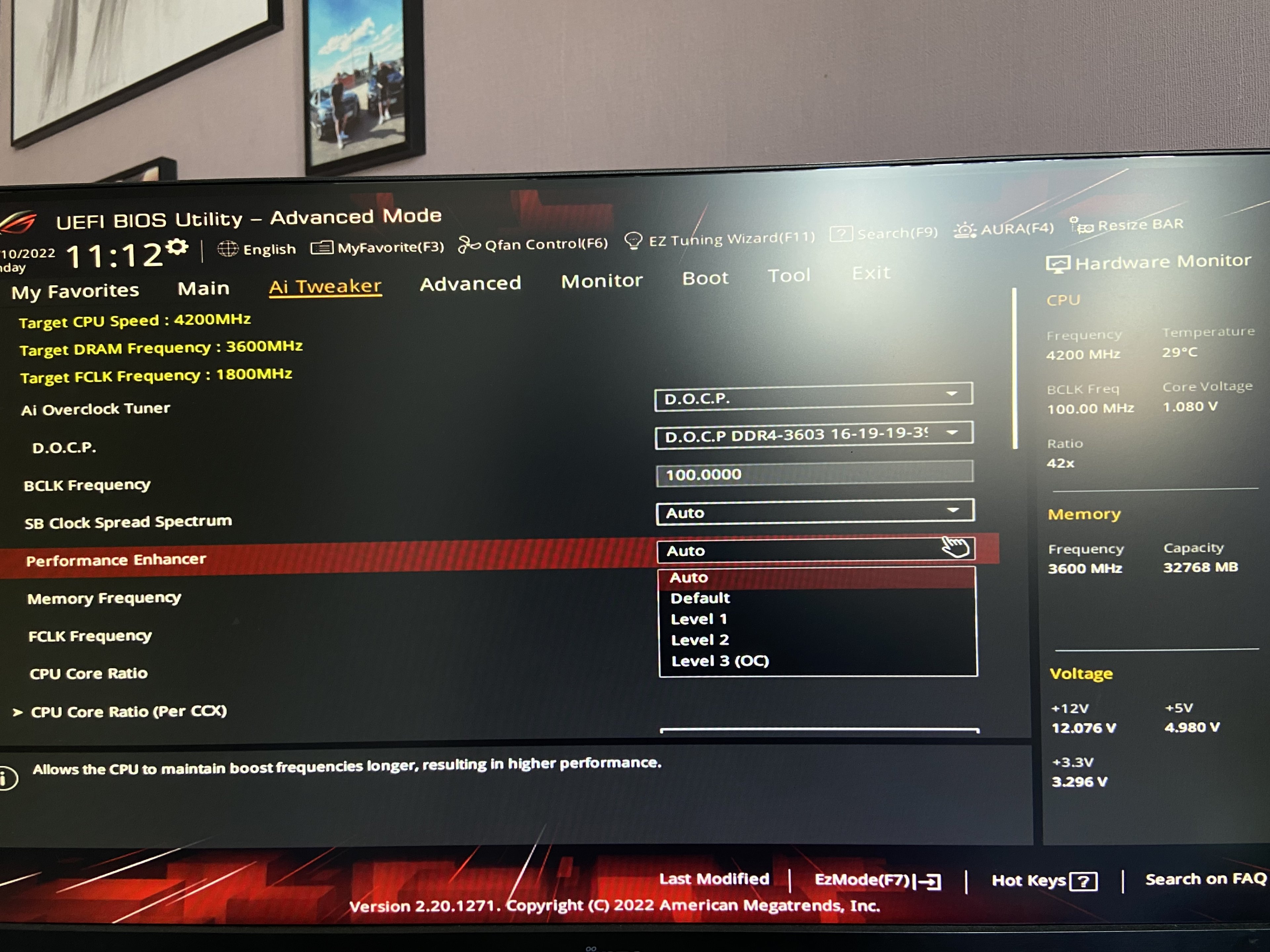 Habe mal ein paar Bilder vom Bios gemacht.Stormfirebird schrieb:Performance Enhancer im Tweaker Menü