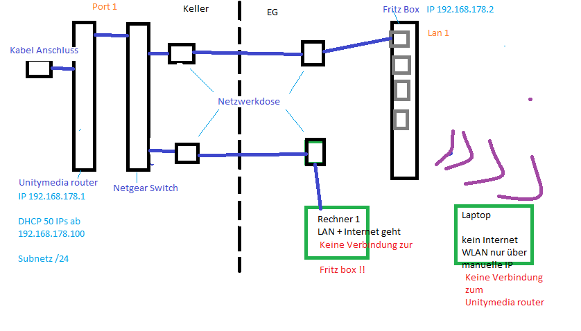 Im Keller kommt von Unitiymedia via Kabel das Internetsignal an. Dort ist auch der mitgelieferte Unitymediarouter (router1) aufgebaut und hat die IP 192.168.178.1 . Er spannt per DHCP ein Netz im Bereich 192.168.178.100 mit 50 Adressen, also bis 192.168.178.150, Subnetzmaske ist für ein 24er Netz, sprich 255.255.255.0