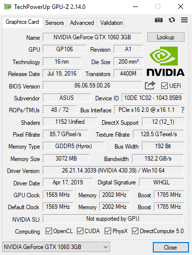 - Graka: ASUS GTX 1060 3GB GDDR5