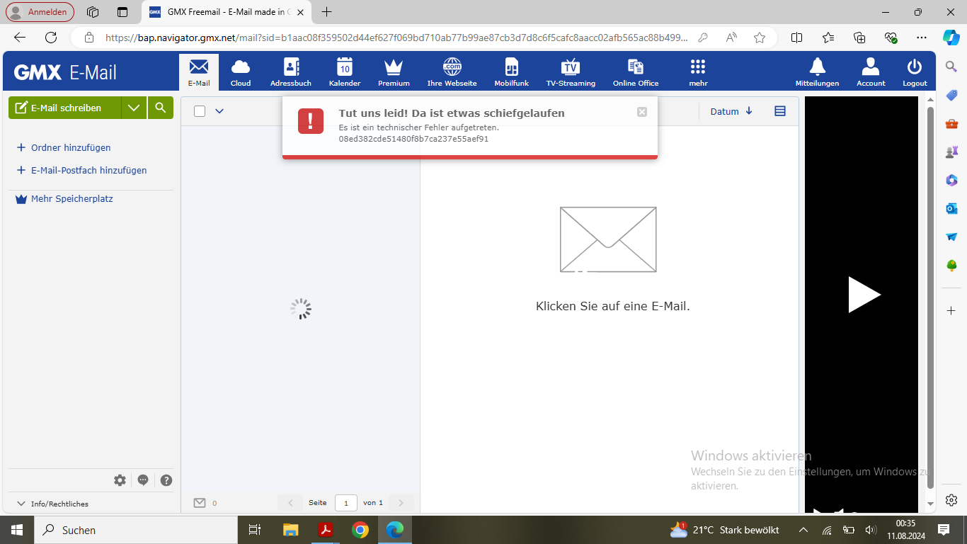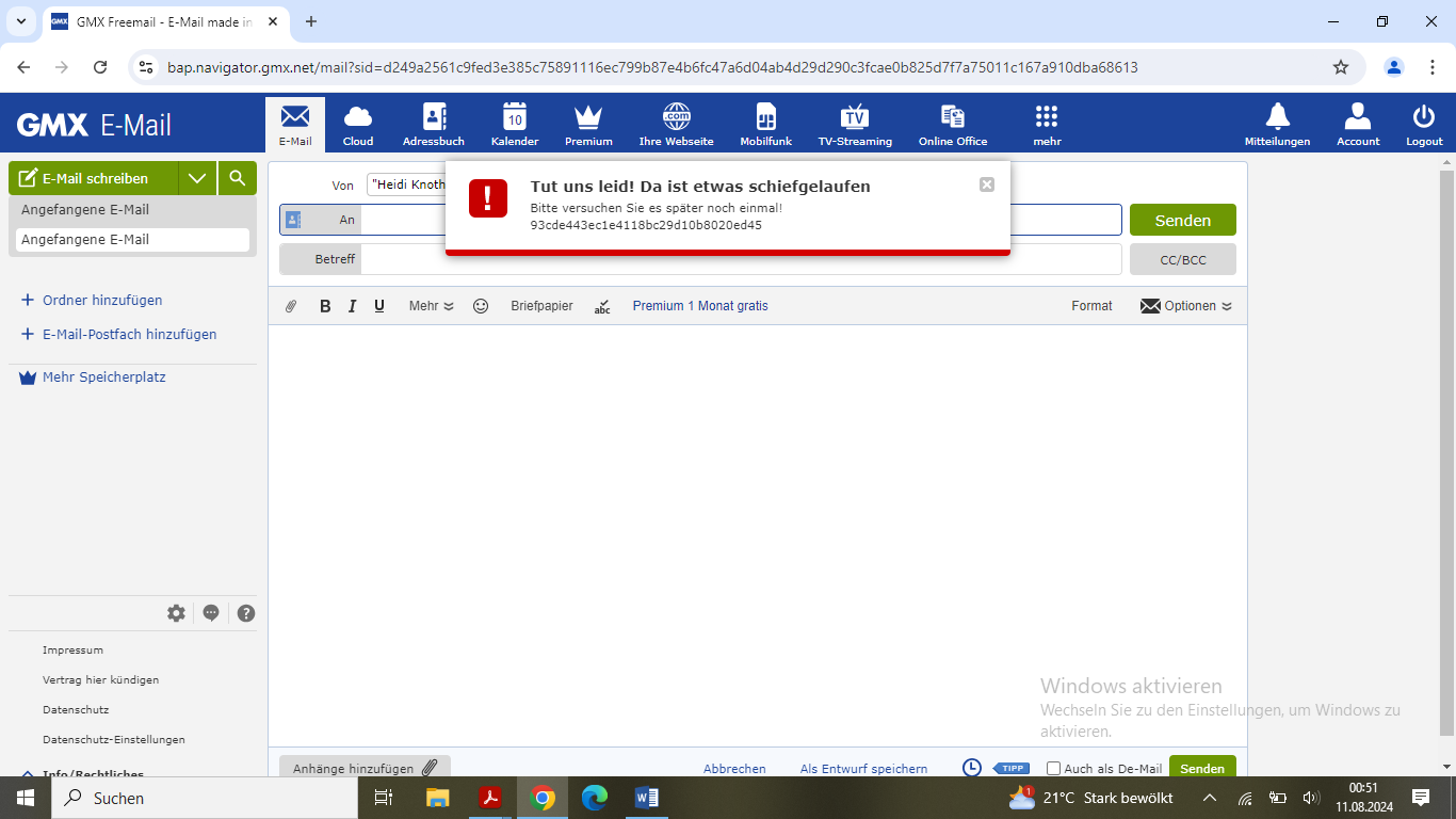 ich habe seit ein paar Tagen Probleme mein GMX Konto auf meinem lenovo ideapad flex 15 model 20309 zu nutzen. Sobald ich mich mit meinen Zugangsdaten eingeloggt habe, klicke ich auf z.B. neue Email schreiben, schreibe die Email und schicke sie ab und erhalte danach die Fehlermeldung "Tut uns leid! Da ist etwas schiefgelaufen" und einen Fehlercode. Email wurde dennoch verschickt aber ich kann dann nichts mehr anklicken.