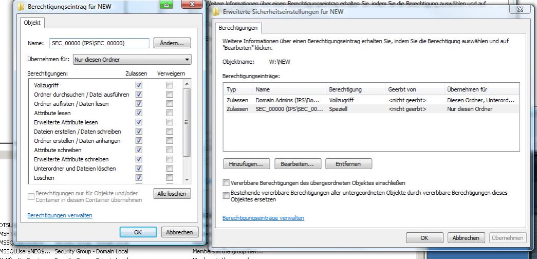 Nun gehe ich zu meinem Ordner auf dem Server, füge hier meine Gruppe "SEC_20000" hinzu, stelle die nötigen Berechtigungen ein und fertig.