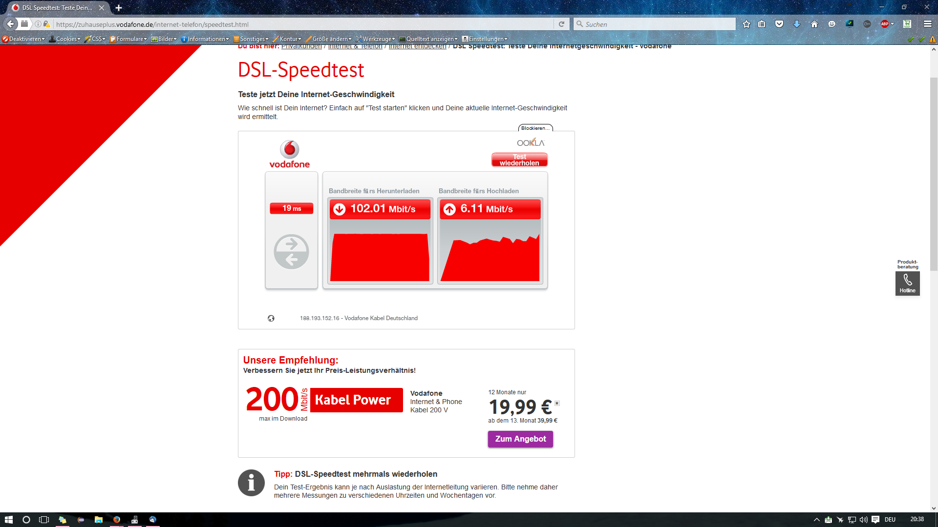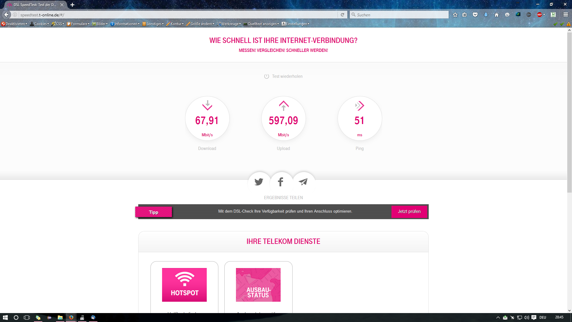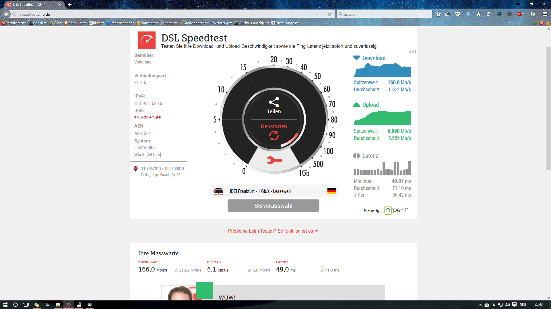 Bei diesem Speedtest bin ich mir ein bisschen unsicher, da er mir komische Upload-Zeiten jenseits der 500 MBit/s gibt, was weit über den 6 MBit/s von meinem Vertrag liegt und mir auch etwas sehr unrealistisch erscheint.