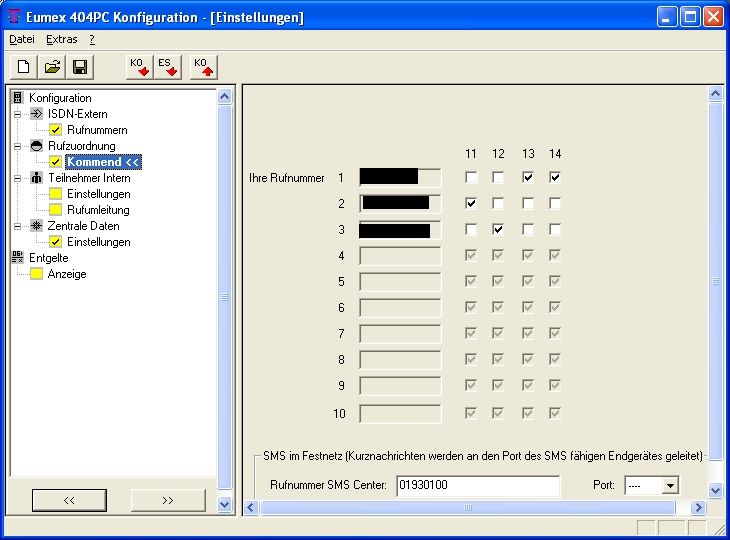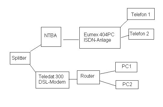 Ich habe von T-Home den Call&Surf Comfort Tarif inkl. ISDN (Hardwareaufbau siehe Bild 1). Funktioniert soweit alles einwandfrei, nur meine Eumex bereitet mir Kopfzerbrechen. Bisher war an Anschluss 13 ein analoges Telefon, das wunderbar funktioniert bzw. es immer noch tut (14 ist eine zusätzliche Glocke in der Küche, bimmelt wenn 13 angerufen wird). 11 und 12 waren ungenutzt. Nun habe ich an 11 ein weiteres analoges Telefon angeschlossen. An und für sich funktioniert es auch, allerdings mit einigen Hindernissen:
