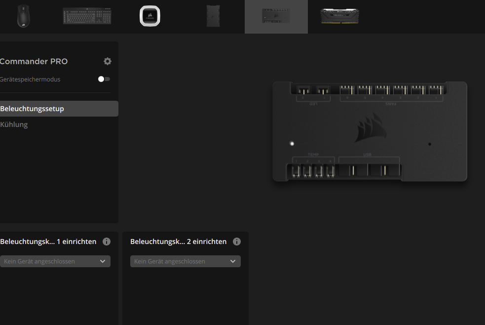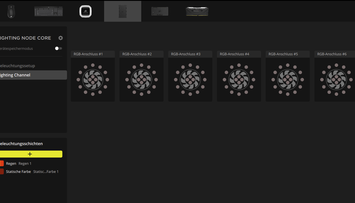 Ich habe RGB Beleuchtung von Corsair. Genauer gesagt sind 6x 140mm Lüfter Corsair LL140, mit einer Comander Pro von Corsair und zusätzlich einem Corsair Lighning Node angeschlossen. Komischerweise funktioniert im ICue nur die Lüfterregelung, aber nicht die Beleuchtung. In der vorherigen Software Corsair LINK, funktioniert alles, auch meine LED STripes von Corsair. Das Corsair Link Programm bekommt aber scheinbar keine Updates mehr und wurde durch Icue Abgelöst. Läuft entsprechend total instabil. Daher musste ich erzwungenermaßen auf iCUe umsteigen. Wieso kann ich RGB regeln über das eine Programm, nicht aber über das andere? Das würde ja ausschließen, dass irgendwas falsch angeschlossen wurde. Ich kann ja auch nur die Stecker auf die USB Ports auf dem Mainboard stecken.