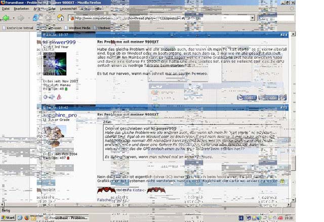 Jetzt hatte ich letzte Woche mal meinen Pc angeschaltet und hatte nachdem er gebootet hatte, im WindowsXP drei senkrechte schwarze Streifen, sah fast so aus als wenn man eine zu hohe Auflösung einstellt hat. Nach einem neustart war alles wieder in Ordnung und heute kam es auch wieder, nach neuem Booten wieder weg!