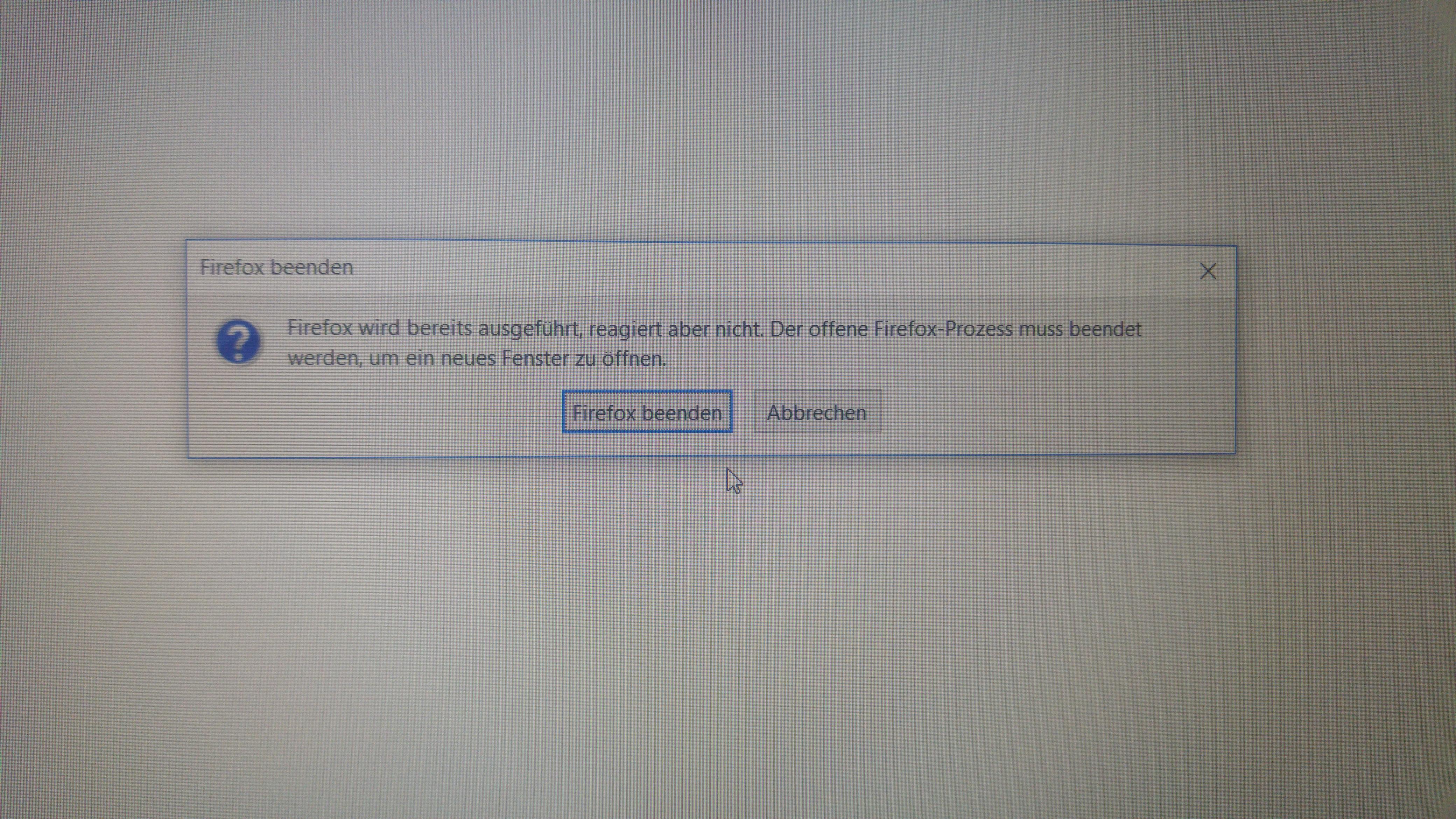 Ich hatte Firefox auf und habe Youtube geguckt. Nachdem ich den Browser geschlossen habe, kam nach einer halben Stunde eine Meldung auf dem Desktop, dass Firefox einen Fehler hat und geschlossen werden muss. Wollte ich danach Firefox starten, dann kam eine Meldung, dass Firefox bereits läuft: