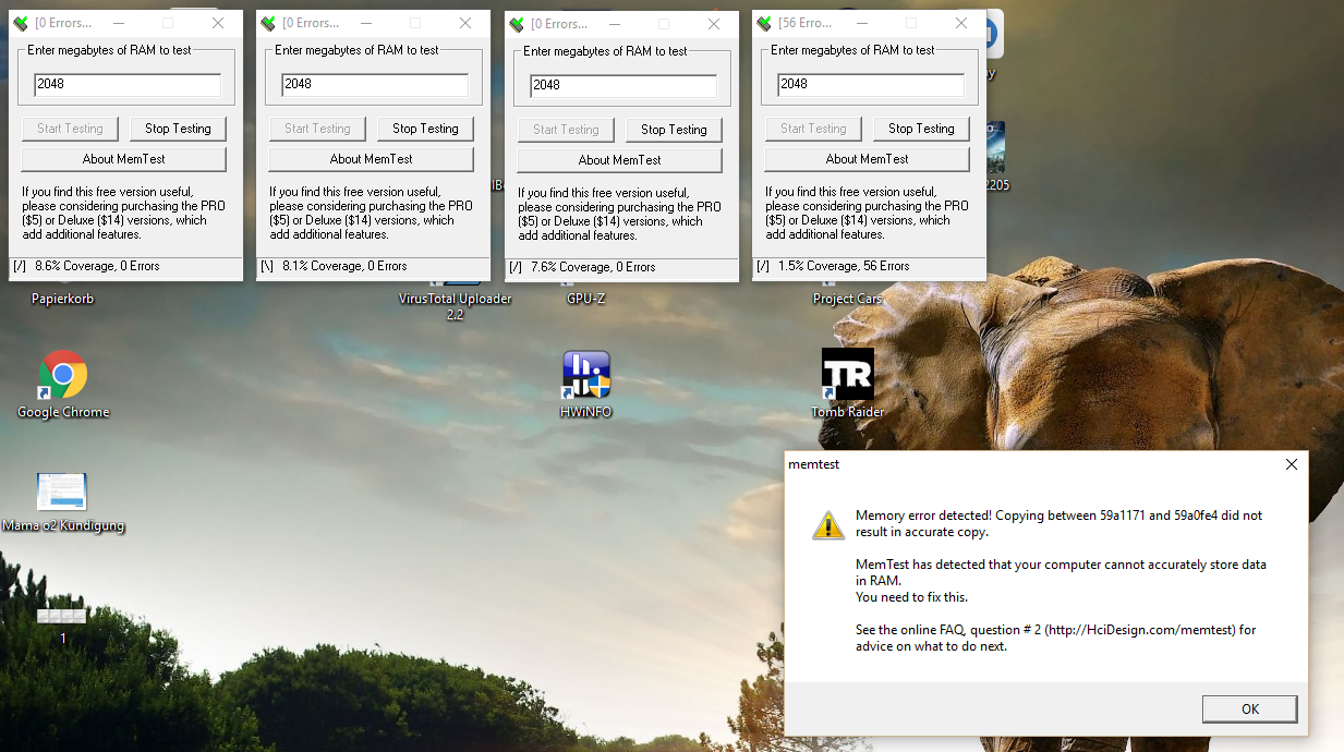 Nach Umrüstung des Kits auf die 16GB habe ich die Timings von der HP übernommen und die 2400 MHz eingestellt. Damit kam es aber sporadisch zu Softwareabstürzen (Logitech Gaming Software, Chrome...). Der erste Memtest verabschiedete sich dann bereits mit einem Bluescreen "System_Service_Excpetion". Nach dem Neustart habe ich Memtest erneut gestartet und ab etwa 0,5% Fortschritt ständig Fehlermeldungen bekommen. Daraufhin habe ich auch das OC der CPU weggenommen und nur noch den Speicher auf den 2400MHz belassen. Das selbe Spiel von vorne mit etlichen Fehlermeldungen.