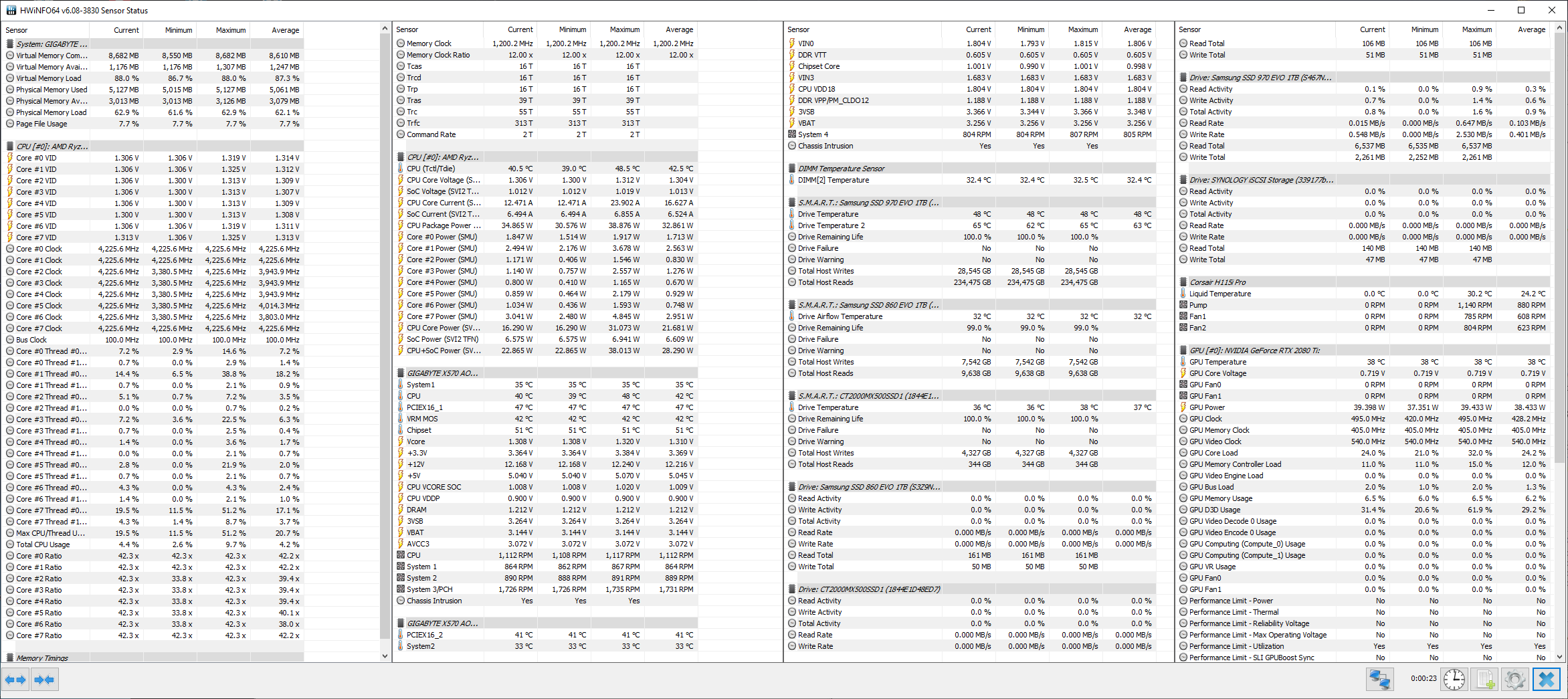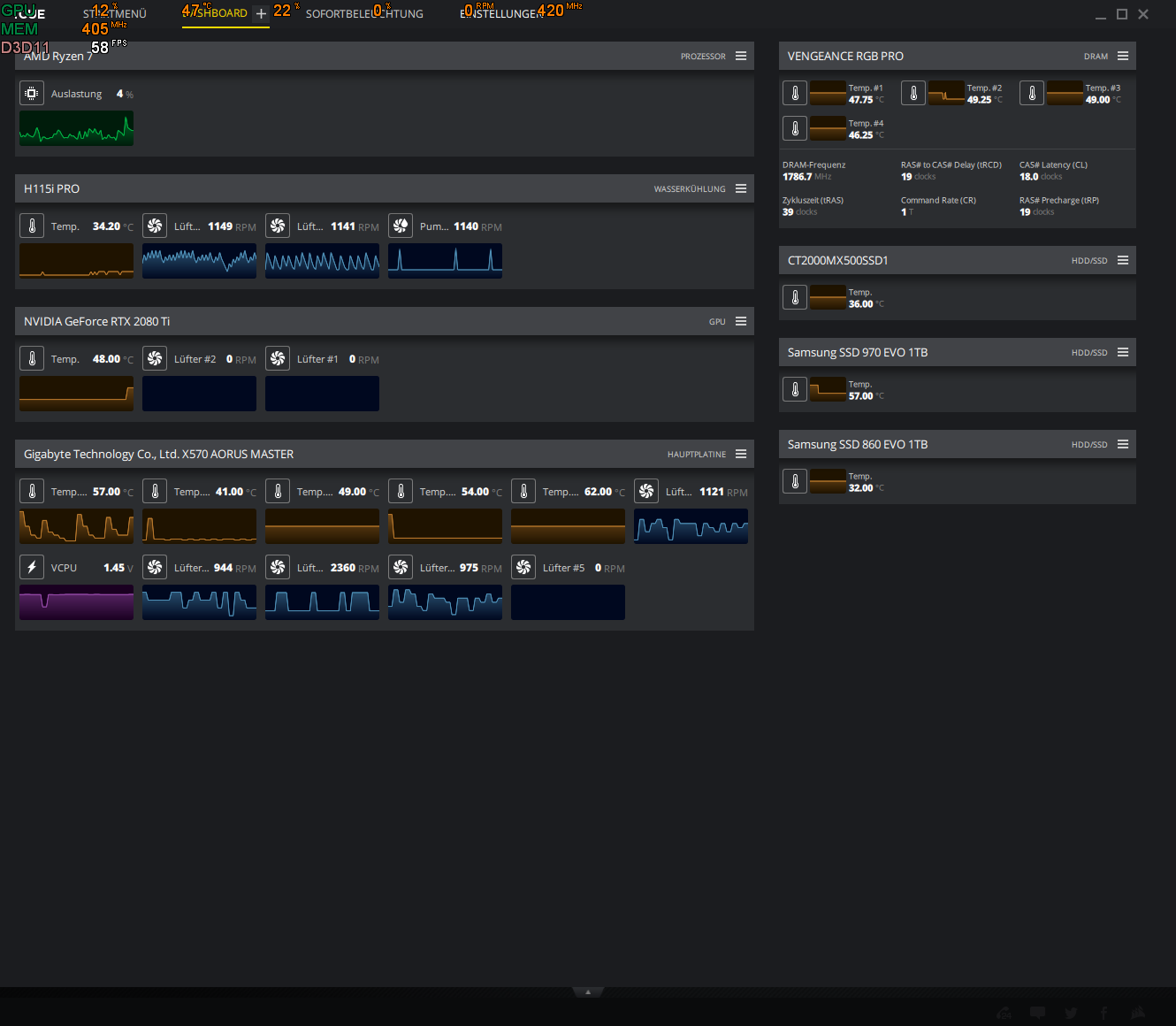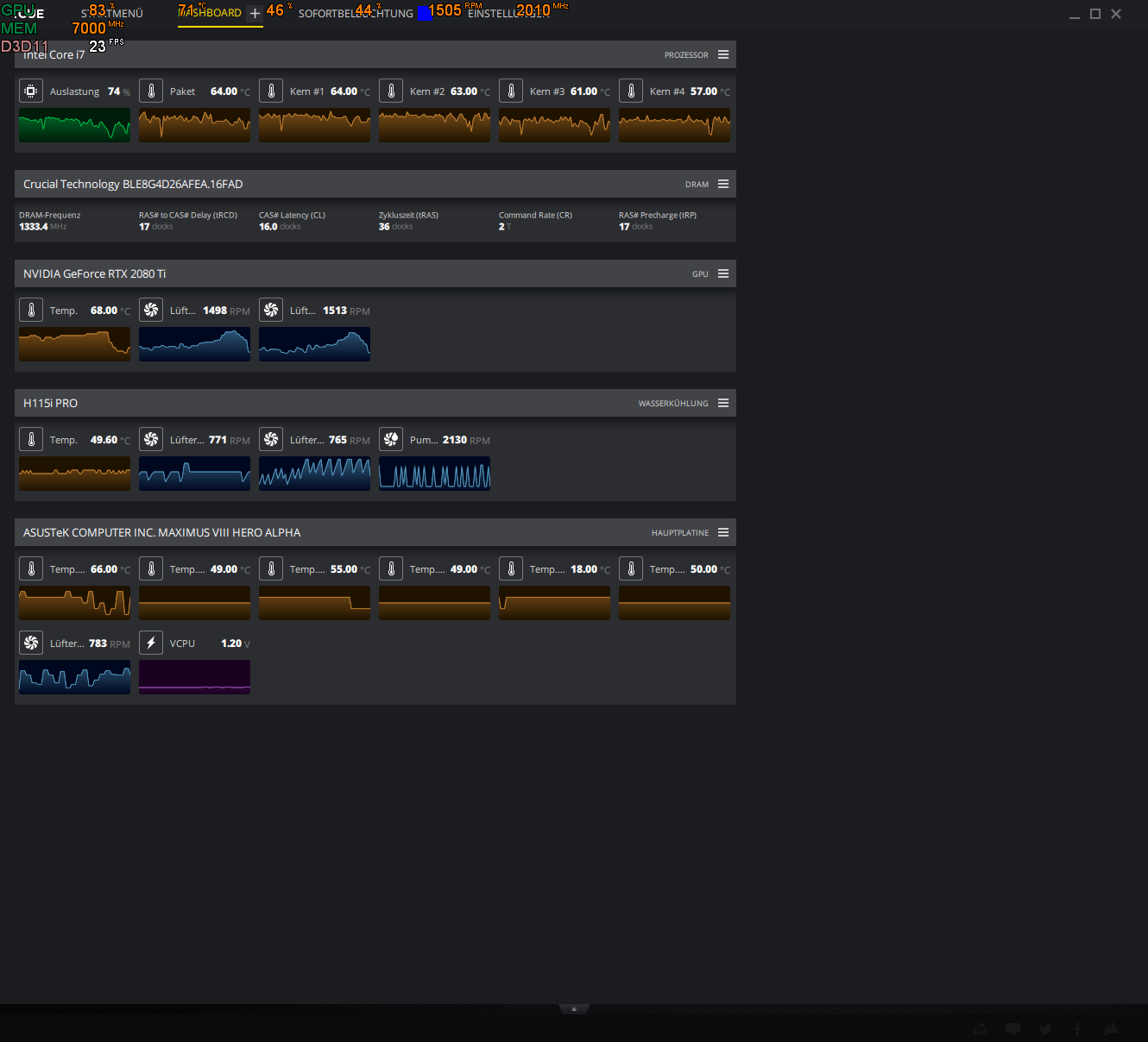 Gehäuse ist ein bequiet DarkBase 600 mit 2*140mm Noctua Front, 1*140mm Noctua back und das H115i ist oben ausblasend montiert.