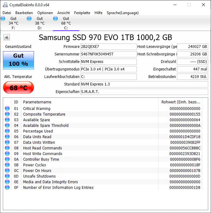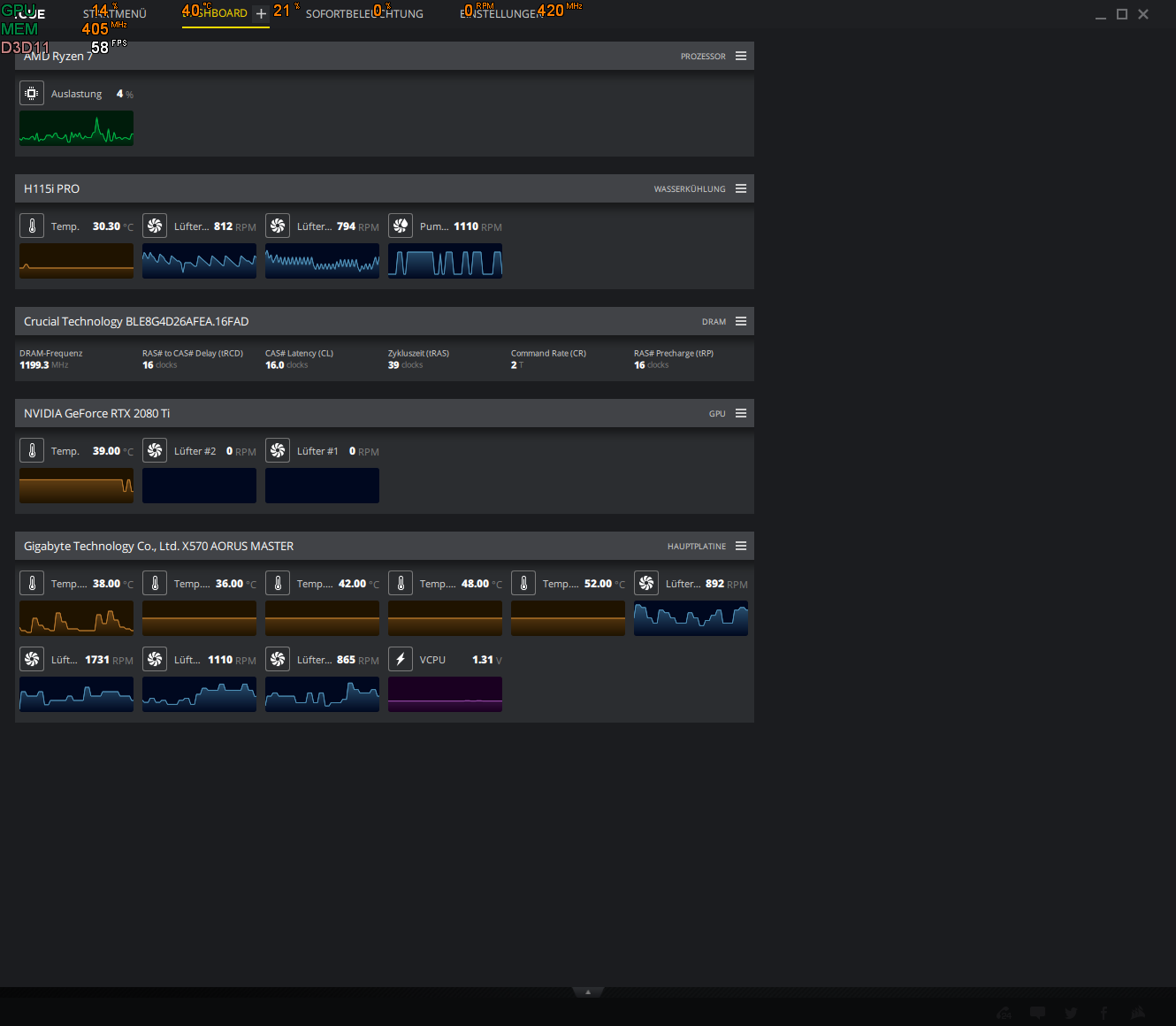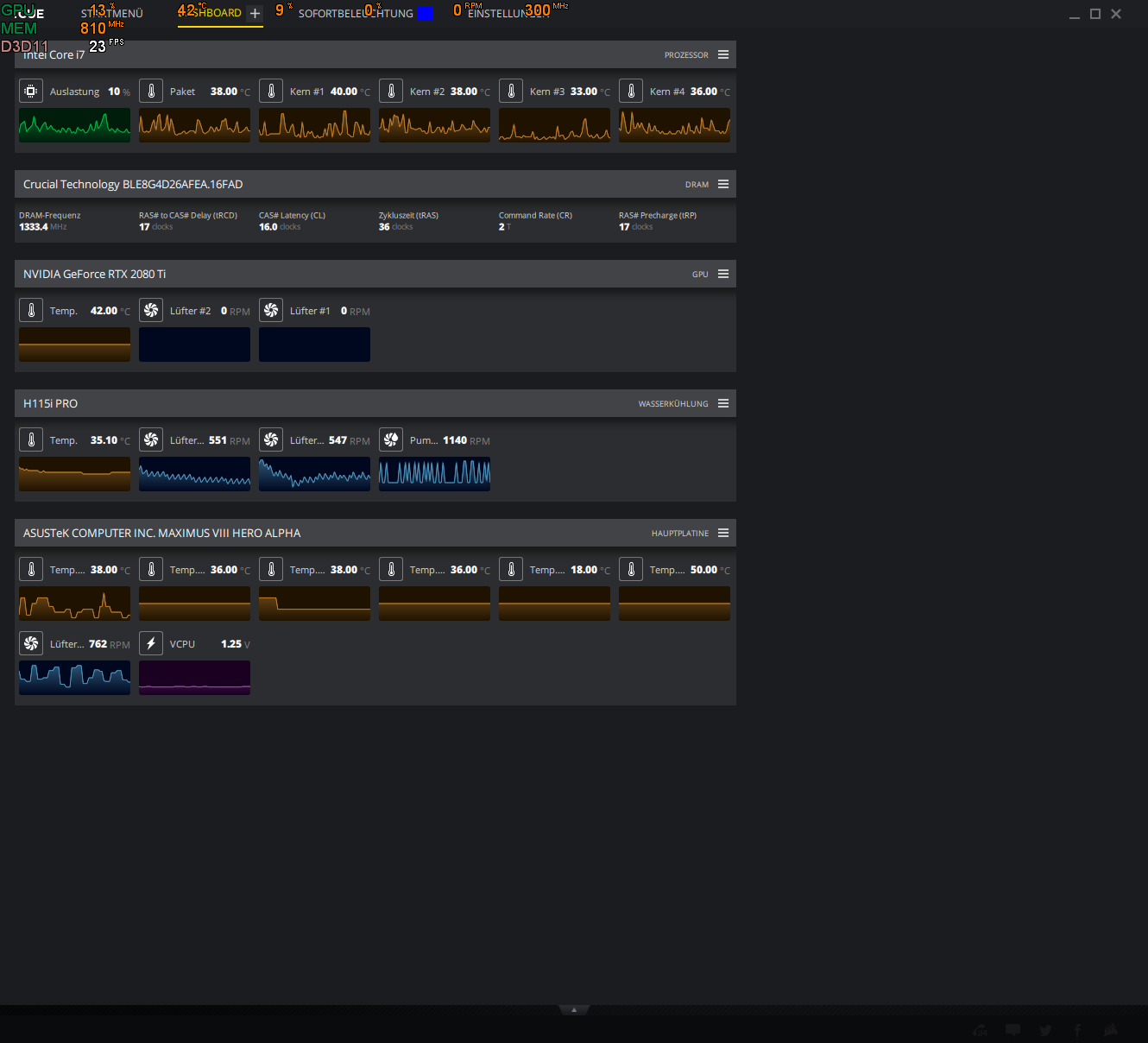 Gerade im Windows Desktop (idle) habe ich bei offenem Gehäuse folgende Werte: