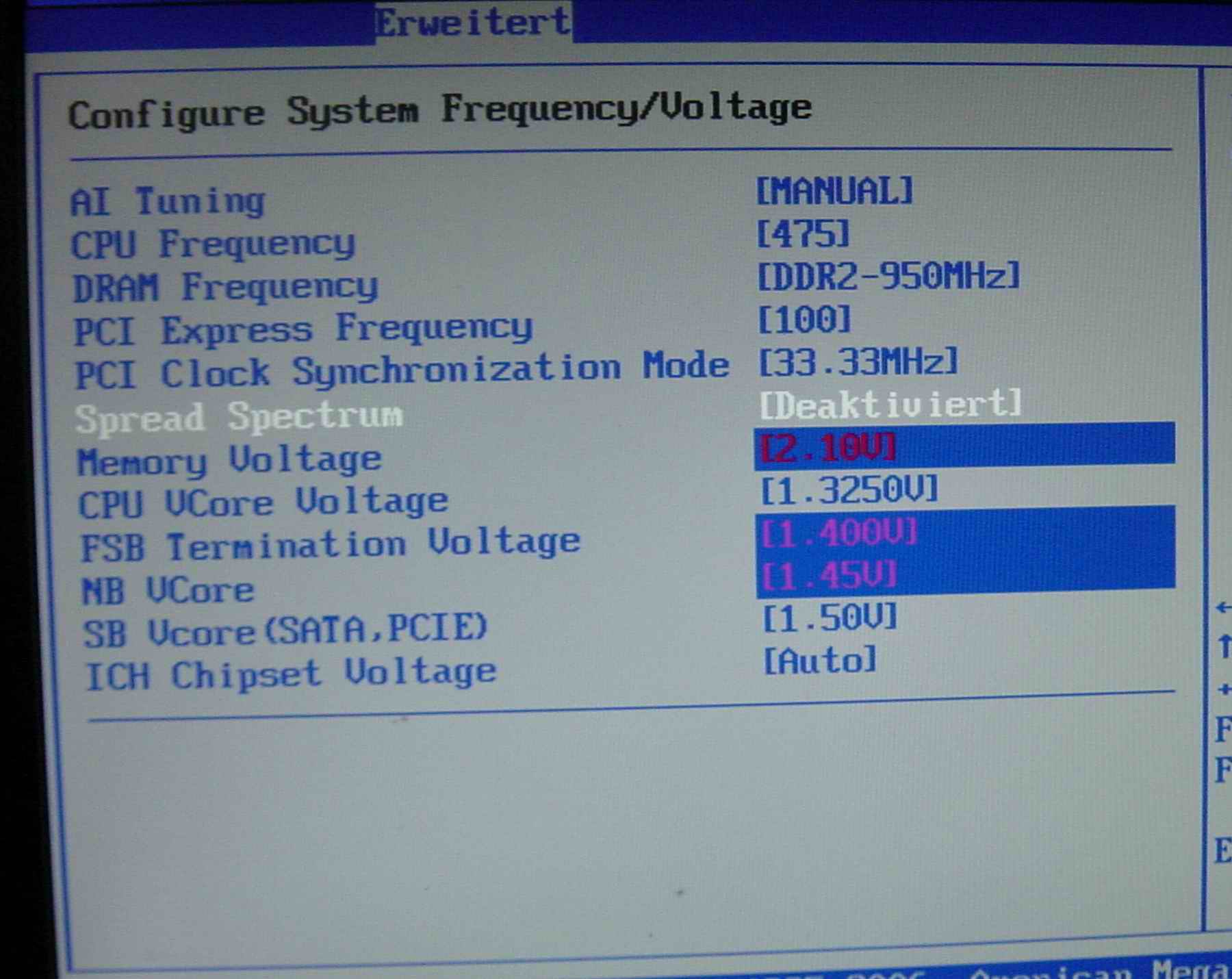 Habe seit dem folgendes Problem, fahre meine Kiste seit Anfang letzten Jahres mit 2 Profilen, eins mit den Standardwerten für einen E6300 und das andere mit 3,3Ghz. In Laufe der Zeit hatte ich 800er Corsairs und 1066er Cellshock drin, und es gab nie Probleme mit dem OC.
