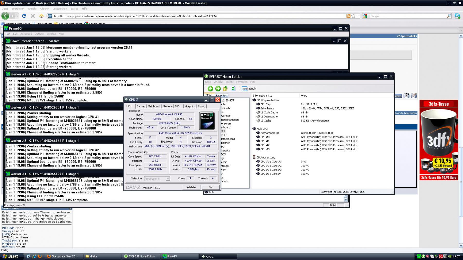 habe mir heute einen Phenom X4 955 Be gekauft und bei mir eingebaut. Habe dann neues BIOS auf mein mainboard (Asus m3n ht-deluxe gespielt (2803). Dann cmos gelöscht und neu geladen. Pc hochgefahren das hat dann auch alles gefunkt. Dann habe ich ein paar benchmarks gemacht und mich gefragt warum ich weniger frames haben als mein alter 6000+.