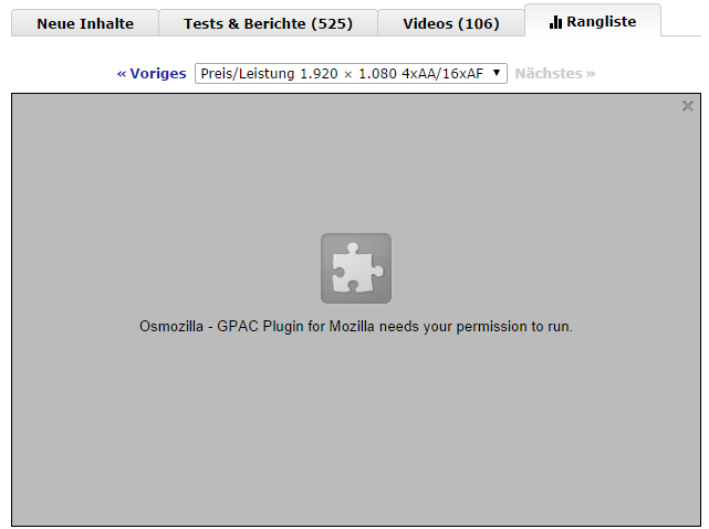 Der Tab friert ein, wenn ich dem Plugin die Berichtigung gebe.osmozilla - gpac plugin for mozilla needs your permission to run