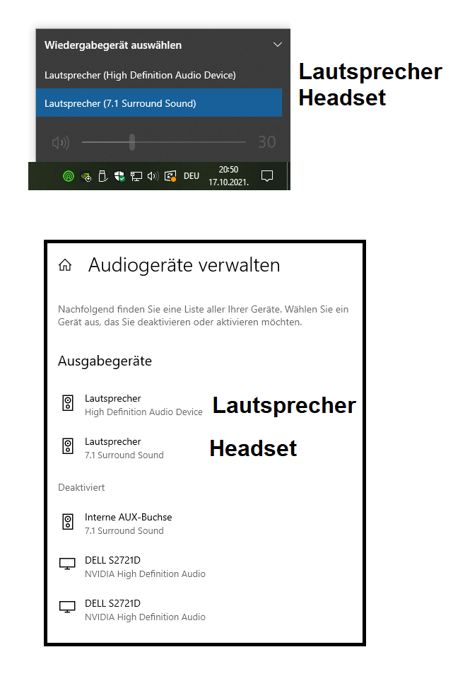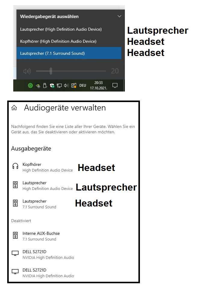 Aber mit der Installation kam ein weiteres Ausgabegerät hinzu, das ich in Grafik Nummer 1 ebenfalls mit "Headset" markiert habe. Unten bei den deaktivierten Geräten Lautsprecher (7.1 Surround Sound).
