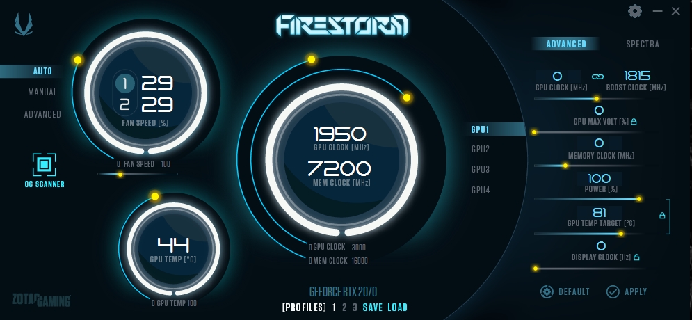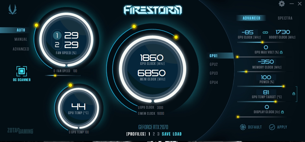 Über das Zotac Firestorm habe ich nun die Werksseitige Übertaktung der Grafikkarte um 85MHz bei der GPU und 350MHz beim Speicher gesenkt.