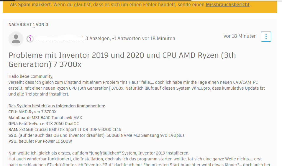 Ich habe in das deutsche Forum eben jene Anfrage erstellt und scheinbar weil ich die einzelnen verbauten Komponenten mit der genauen Produktbezeichnung aufgeführt habe, wurde der Beitrag 3x als Spam markiert. Nun ist er gelöscht.