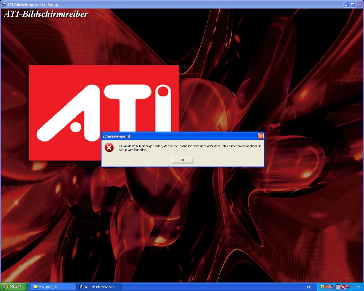 Zuerst dachte ich an DirectX und installierte es in der Version 9c doch keine Besserung. Dann wollte ich neue Treiber für die Karte installieren und bediente mich dieser Treiber (http://game.amd.com/us-en/drivers_catalyst.aspx?p=xp/radeonx-xp) die mir auf der ATI Seite für WinXP/Radeon/3600 Series vorgeschlagen wurden. Wenn ich jedoch die allten Treiber entferne und die neuen installieren will zeigt sich mir das andere angehängte Bild.