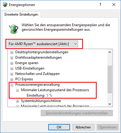 In den Energieoptionen den Ryzen-Balanced-Power-Plan wählen und die minimale CPU-Leistung auf 5% einstellen.