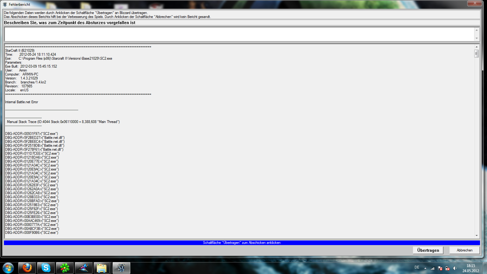 Hey, hab auf nem Laptop SC2 installiert, erst kam die Fehlermeldung "Beim Start von Starcraft 2 ist ein Fehler aufgetreten. Bitte versuchen Sie es erneut." Nach nem Restart war diese komischerweise weg, jetzt startet es sogar, bei dem Ladebildschirm (Space-Marine) stürzt es ab und der Fehlerbericht im Anhang öffnet sich. Was soll ich da tun?