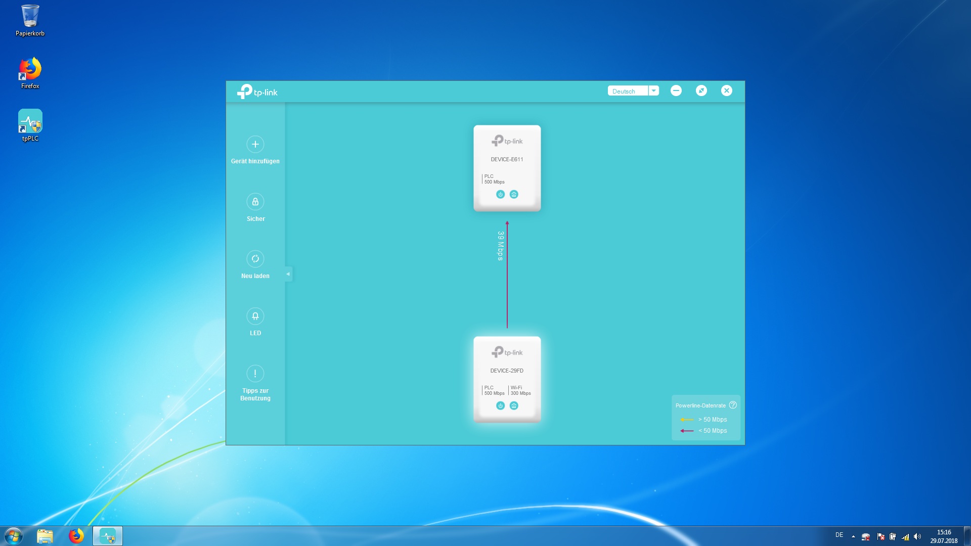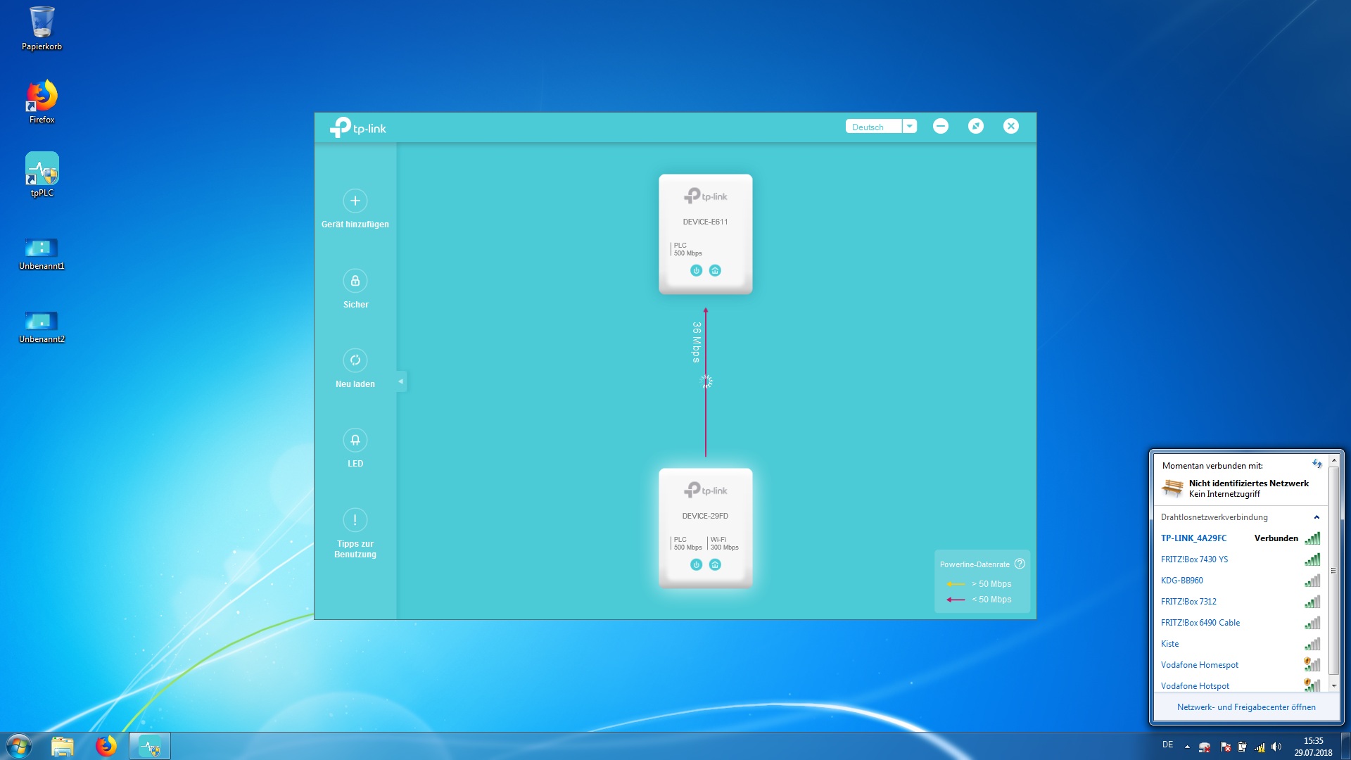 Anbei ein paar Screenshots von meinem Notebook und dem "PowerLineUtility". Es zeigt hier beide Adapter und plötzlich dann nur einen. Auch der nicht existente Internetzugang über WLAN ist unten Rechts ersichtlich.