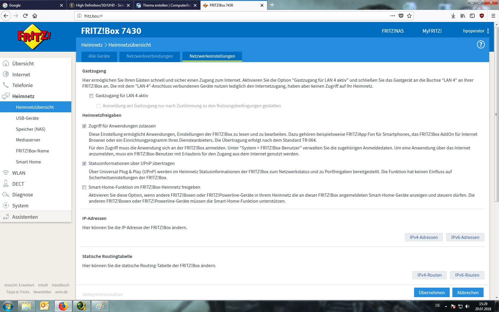 Zudem besteht das sporadische Problem, dass ich mit meinem "normalen" PC, welcher mit eiem DSL-Kabel mit dem Router verbunden ist, nicht einwandfrei auf die Einstellungen der Fritzbox zugreifen kann. Die Ladezeiten nach der Passworteingabe sind sehr lange (oftmals hängt er sich auch hier auf) und auch der Kartenreiterwechsel bei der "Heimnetzübersicht" dauert auch etwas....
