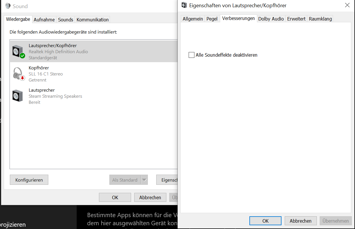 In meinem Fall sind am Laptop auch (mal wieder) nicht alle Audio"verbesserungen" deaktiviert.