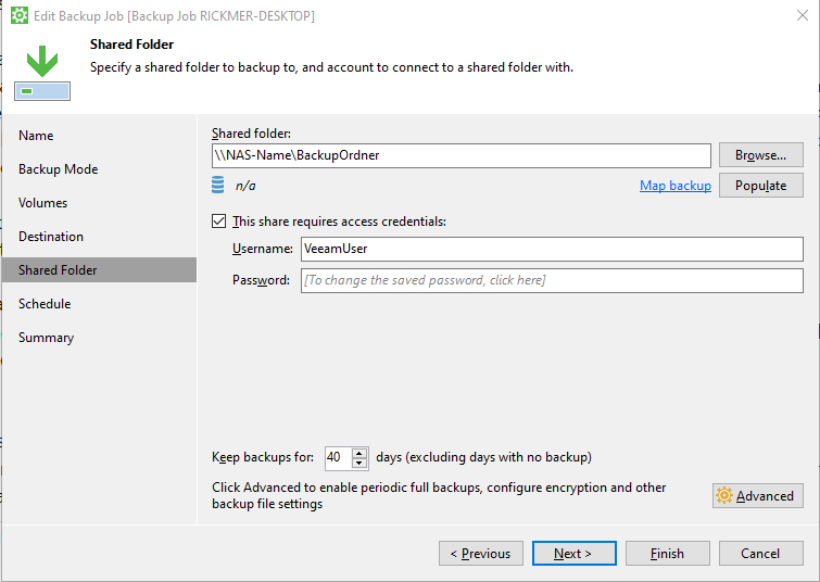 Volume level backup (ich möchte nur das Systemlaufwerk und eine Platte mit Daten sichern, die Platte mit Games und so soll nicht gesichert werden) -> Volume C: und F: ausgewählt (257GB) -> Destination: Shared Folder (NAS) ->Nun browse ich nach dem NAS, im VEEAM kommt der Fehler: "Last Error: Die Liste der Server in dieser Arbeitsgruppe ist zur Zeit nicht verfügbar."