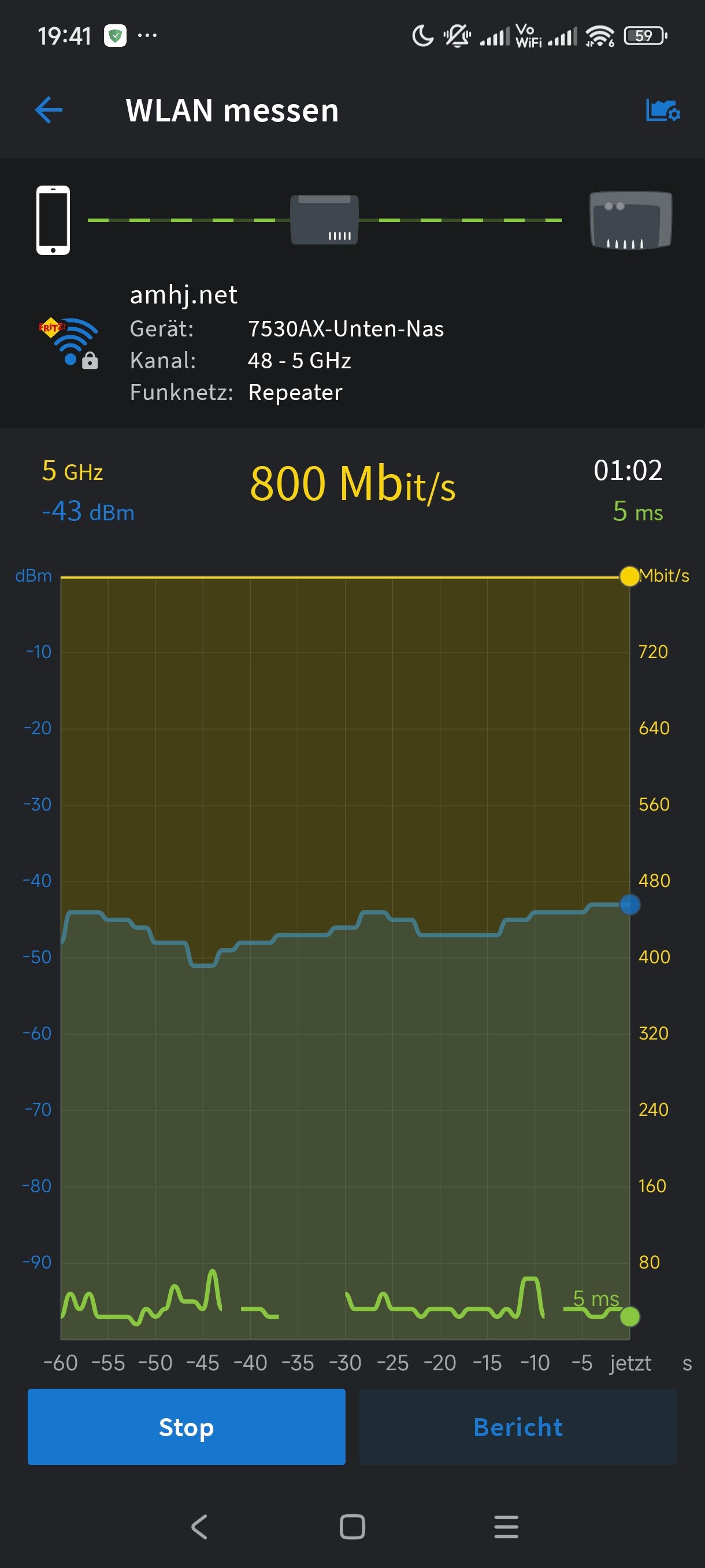 Hier Im Wohnzimmer steht eine Fritzbox 7530AX als Mesh Repeater per Lankabel (GB-LAN) angeschlossen.