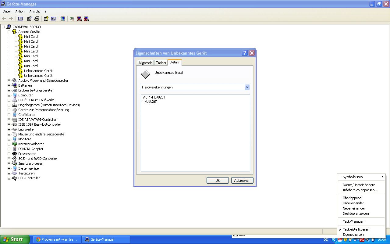 Hallo, habe Win XP auf einem Fujitsu Siemenst T5010 Lifebook installiert. Übr die Herstellerseite konnte ich eigentlich alle benötigten Treiber downloaden. Leider habe ich es bisher nicht geschafft den WLAN Treiber zu installieren. Es kommt immer noch die Meldung über neue Hardware "Mini Card". Ich habe schon mehrfach, auch verschiedene Treiber Mini Card die ich für dieses Notebook gefunden habe getsestet. Keines funktioniert. Die Meldung erscheint weiterhin.