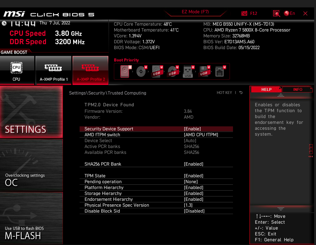 Das hat sich später geklärt, denn er aktivierte fTPM unter den CPU Optionen im BIOS.