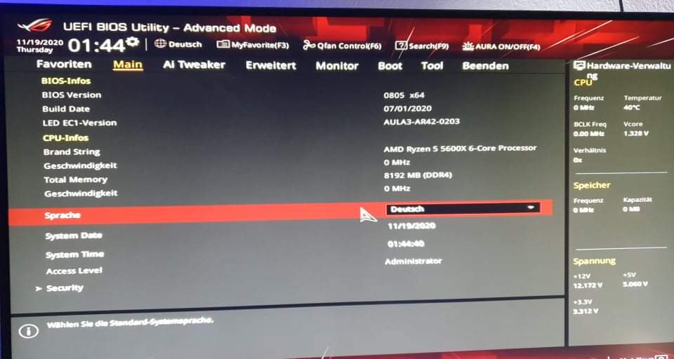 Die Komponenten werden soweit im BIOS erkennt, allerdings werden beim RAM und CPU ein Takt von 0 MHz angezeigt (Siehe Screenshot).