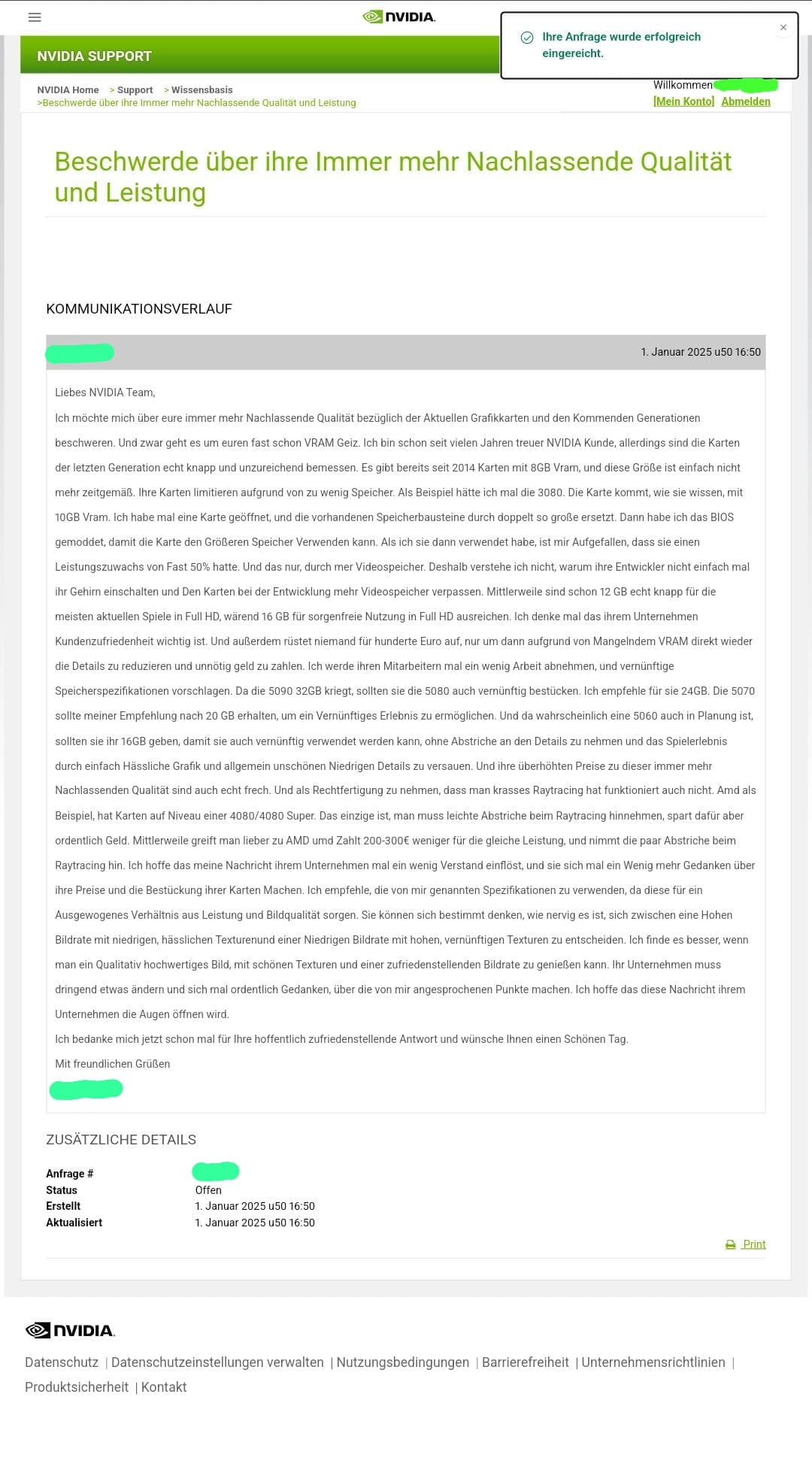 Ich möchte mich über eure immer mehr Nachlassende Qualität bezüglich der Aktuellen Grafikkarten und den Kommenden Generationen beschweren. Und zwar geht es um euren fast schon VRAM Geiz. Ich bin schon seit vielen Jahren treuer NVIDIA Kunde, allerdings sind die Karten der letzten Generation echt knapp und unzureichend bemessen. Es gibt bereits seit 2014 Karten mit 8GB Vram, und diese Größe ist einfach nicht mehr zeitgemäß. Ihre Karten limitieren aufgrund von zu wenig Speicher. Als Beispiel hätte ich mal die 3080. Die Karte kommt, wie sie wissen, mit 10GB Vram. Ich habe mal eine Karte geöffnet, und die vorhandenen Speicherbausteine durch doppelt so große ersetzt. Dann habe ich das BIOS gemoddet, damit die Karte den Größeren Speicher Verwenden kann. Als ich sie dann verwendet habe, ist mir Aufgefallen, dass sie einen Leistungszuwachs von Fast 50% hatte. Und das nur, durch mer Videospeicher. Deshalb verstehe ich nicht, warum ihre Entwickler nicht einfach mal ihr Gehirn einschalten und Den Karten bei der Entwicklung mehr Videospeicher verpassen. Mittlerweile sind schon 12 GB echt knapp für die meisten aktuellen Spiele in Full HD, wärend 16 GB für sorgenfreie Nutzung in Full HD ausreichen. Ich denke mal das ihrem Unternehmen Kundenzufriedenheit wichtig ist. Und außerdem rüstet niemand für hunderte Euro auf, nur um dann aufgrund von Mangelndem VRAM direkt wieder die Details zu reduzieren und unnötig geld zu zahlen. Ich werde ihren Mitarbeitern mal ein wenig Arbeit abnehmen, und vernünftige Speicherspezifikationen vorschlagen. Da die 5090 32GB kriegt, sollten sie die 5080 auch vernünftig bestücken. Ich empfehle für sie 24GB. Die 5070 sollte meiner Empfehlung nach 20 GB erhalten, um ein Vernünftiges Erlebnis zu ermöglichen. Und da wahrscheinlich eine 5060 auch in Planung ist, sollten sie ihr 16GB geben, damit sie auch vernünftig verwendet werden kann, ohne Abstriche an den Details zu nehmen und das Spielerlebnis durch einfach Hässliche Grafik und allgemein unschönen Niedrigen Details zu versauen. Und ihre überhöhten Preise zu dieser immer mehr Nachlassenden Qualität sind auch echt frech. Und als Rechtfertigung zu nehmen, dass man krasses Raytracing hat funktioniert auch nicht. Amd als Beispiel, hat Karten auf Niveau einer 4080/4080 Super. Das einzige ist, man muss leichte Abstriche beim Raytracing hinnehmen, spart dafür aber ordentlich Geld. Mittlerweile greift man lieber zu AMD umd Zahlt 200-300€ weniger für die gleiche Leistung, und nimmt die paar Abstriche beim Raytracing hin. Ich hoffe das meine Nachricht ihrem Unternehmen mal ein wenig Verstand einflöst, und sie sich mal ein Wenig mehr Gedanken über ihre Preise und die Bestückung ihrer Karten Machen. Ich empfehle, die von mir genannten Spezifikationen zu verwenden, da diese für ein Ausgewogenes Verhältnis aus Leistung und Bildqualität sorgen. Sie können sich bestimmt denken, wie nervig es ist, sich zwischen eine Hohen Bildrate mit niedrigen, hässlichen Texturenund einer Niedrigen Bildrate mit hohen, vernünftigen Texturen zu entscheiden. Ich finde es besser, wenn man ein Qualitativ hochwertiges Bild, mit schönen Texturen und einer zufriedenstellenden Bildrate zu genießen kann. Ihr Unternehmen muss dringend etwas ändern und sich mal ordentlich Gedanken, über die von mir angesprochenen Punkte machen. Ich hoffe das diese Nachricht ihrem Unternehmen die Augen öffnen wird.