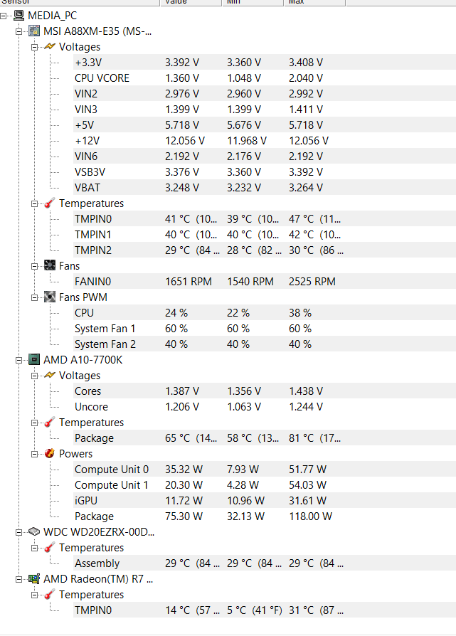 Das Problem ist folgendes, wenn ich die Temperaturen im Hardware Monitor auslese, sind die Temperaturen für die Cpu relative hoch, und teilweise sogar zu hoch. Allerdings bleibt der Lüfter trotz hoher Temperaturen immer bei 20-30%. Ich bin mir ziemlich sicher der Grund dafür ist das sich das Mainboard die Temperatur von einem anderen Sensor holt: TMPIN der immer relativ normale Temperaturen zeigt. Welchem Sensor soll ich glauben?