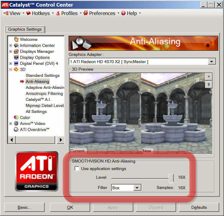 Ich habe eine ATI Sapphire 4870X2 und im neuen Catalyst 9.2 Treiber habe ich einen Profile-Manager gefunden. Leider sind dort keine fertigen Profile auswählbar.