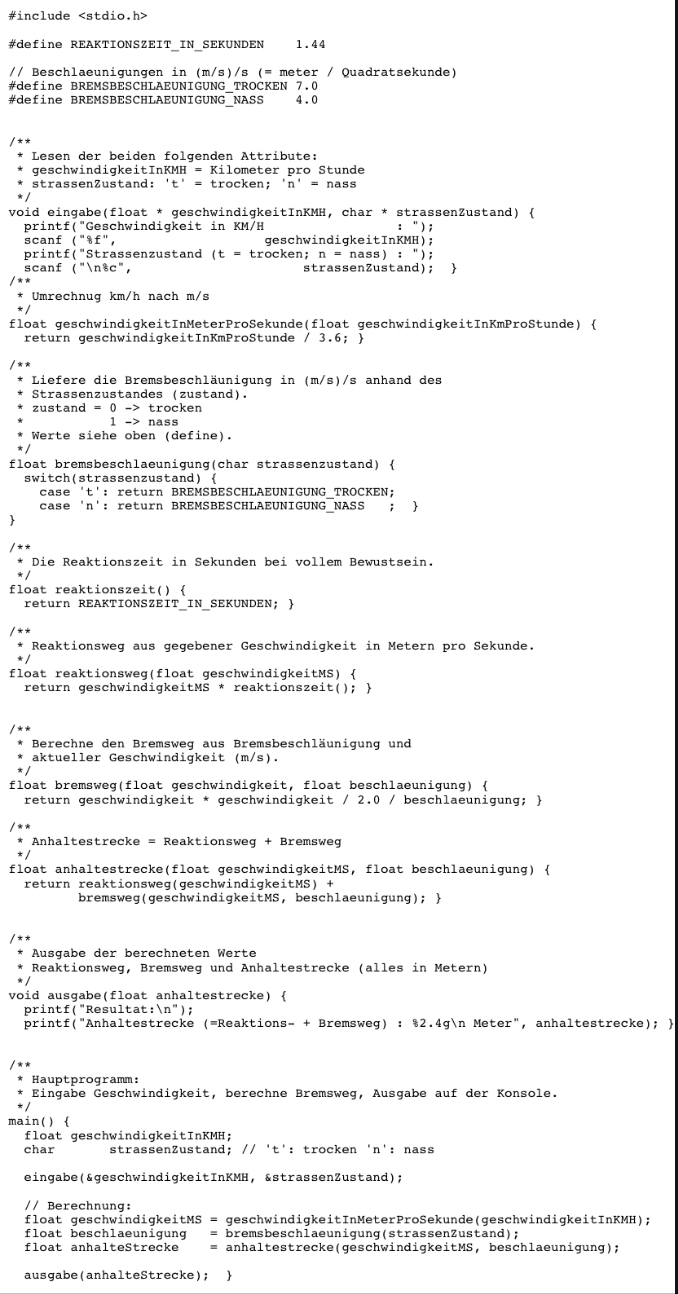 Moin Freunde, ich bin Studierender im ersten Semester und muss eine Aufgabe zur Programmierung eines Anhaltewegs im Fall, wenn die Ampel von grün auf gelb springt, dazu muss ich den anhalteweg programmieren. Ich hab mir ein Programm geschrieben, welches aber noch Fehler ausweist. Zum Beispiel reagiert mein Programm bei einer falschen oder unzulässigen Eingabe nicht. Da ich noch relativ neu in Bereich des Programmieren in C bin, habe ich nicht soooo viel Ahnung von der Thematik.