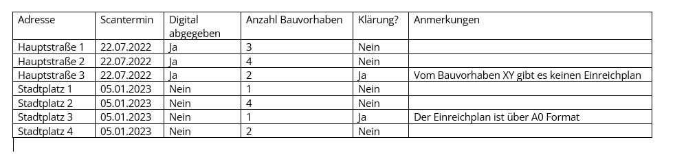 Kurze Info was wir für Daten eintragen wollen: Die Kategorien sind unsere Kunden (Gemeinden). Für jede Gemeinde legen wir alle Adressen in Zeilen an. In den Spalten sind Informationen zu diesen Adressen. (Wir digitalisieren die Bauakte).