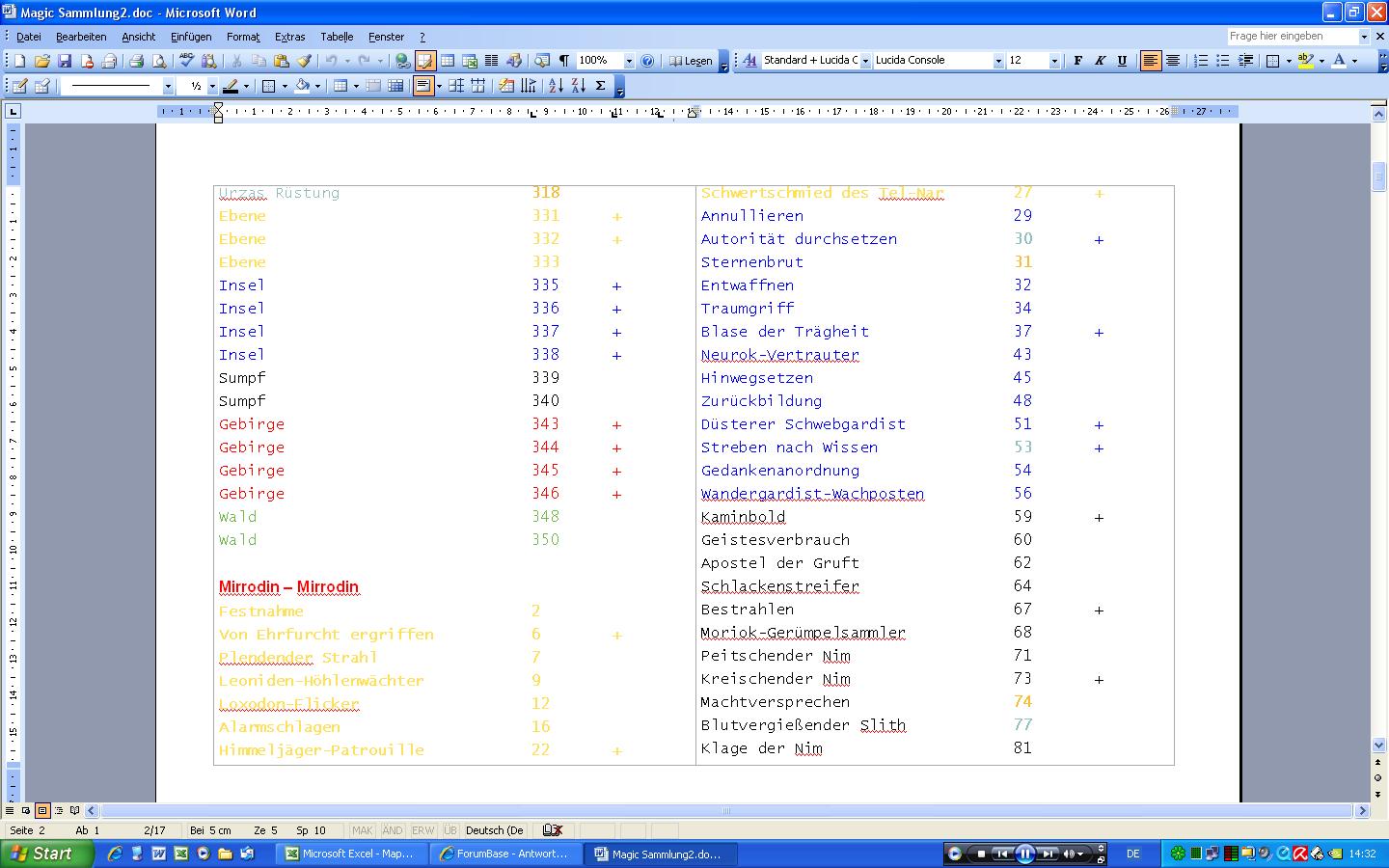 seht mal auf die tabelle im anhang: wenn ich die tabelle so wie sie dort ist ins excel übertrage und eine zahl hinzufügen muss (irgendwo dazwischen) verschiebt sich alles um eins nach unten auch die zweite spalte.
