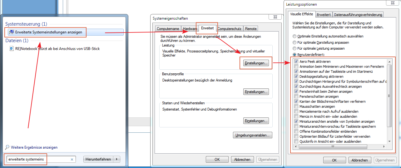 In den erweiterten Systemeigenschaften > Erweitert > Leistung gibt's diverse Einstellungen für Fensteranimationen, Schatten etc.