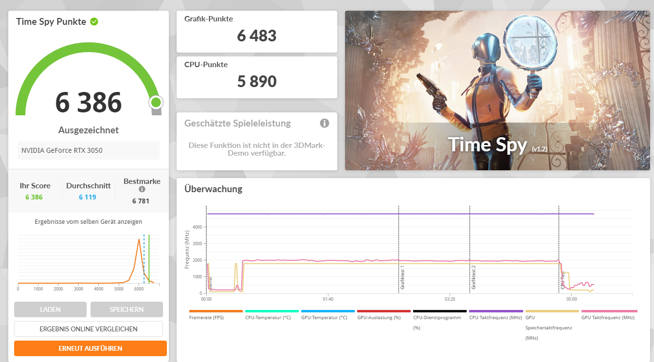 - 3DMark Time Spy: Ein Score von 6.403 Punkten rückt den Rechner in die direkte Nähe moderner Karten wie der RX 6600 oder der RTX 2060 Super.