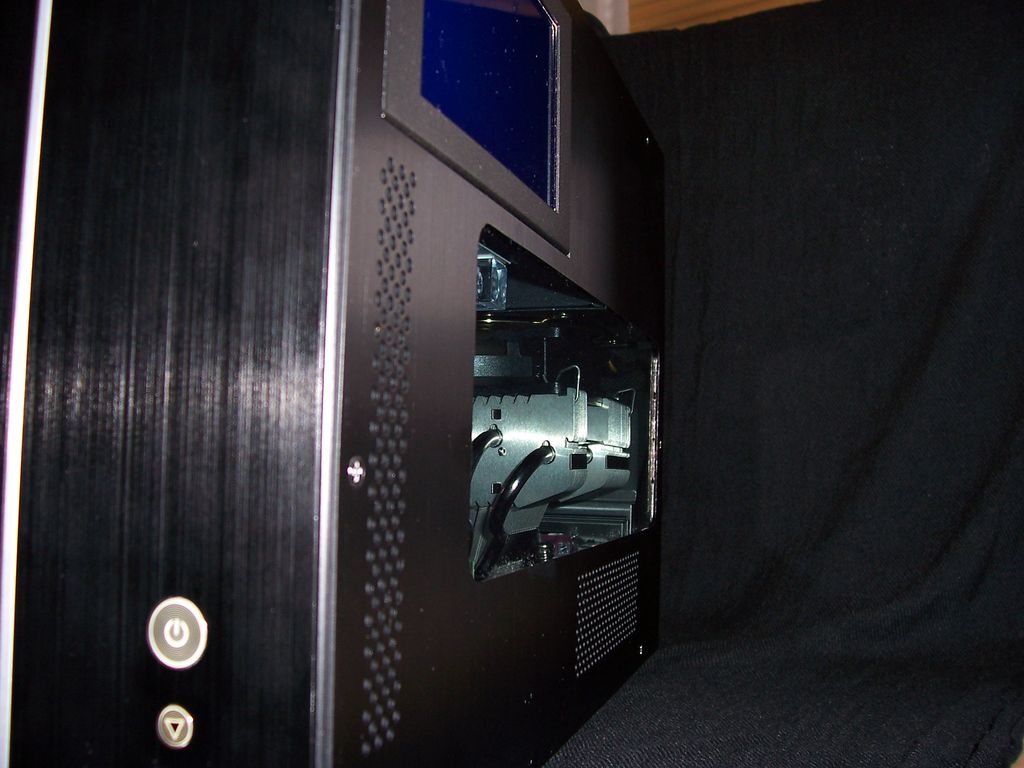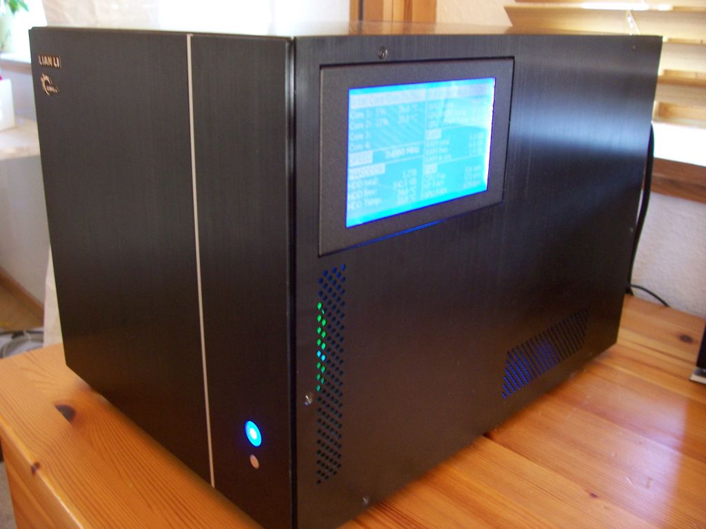 Grundsätzlich ist das Lian Li V350 nur für den Einsatz von zwei 3,5" Festplatten ausgelegt. Aber es besteht die Möglichkeit in den 5,25" Schächten noch eine weitere Festplatte zu verbauen. Dieser Einbauort ist auch wie geschaffen für den Einbau einer SSD Platte. Diese entwickeln kaum Abwärme und sind daher auch nicht auf aktive Kühlung angewiesen. Dies habe ich jedenfalls so gemacht. Es befindet sich hinter dem Display eine MTron MOBI 3525. In dem PCIe 4x Slot sitzt ein Areca ARC-1210 PCIe RAID Controller mit 256MB Cache. Es handelt sich hierbei um einen PCIe8x Controller. Dieser funktioniert, dank offenem PCIe4x Slot, ohne Probleme.
